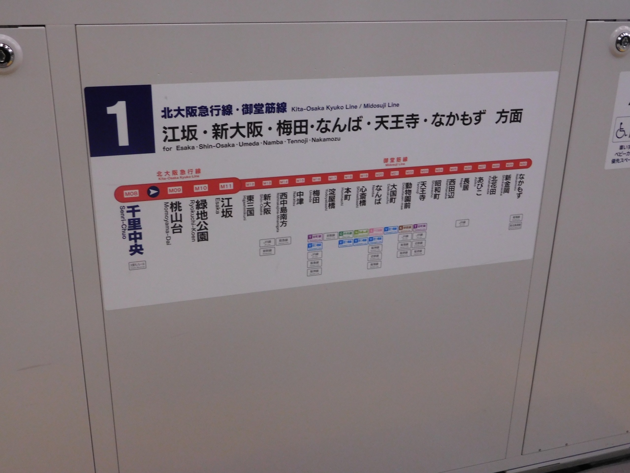 新大阪駅から地下鉄に乗る場合は、この「御堂筋線」を利用する事になります。乗り換えの際、駅のインフォメーションセンターで地下鉄の路線図を頂きました。梅田、心斎橋、なんば、天王洲、などにも停車するので結構混み合っていましたが、新幹線を降りてすぐに利用できる路線なので、便利で良かったです。