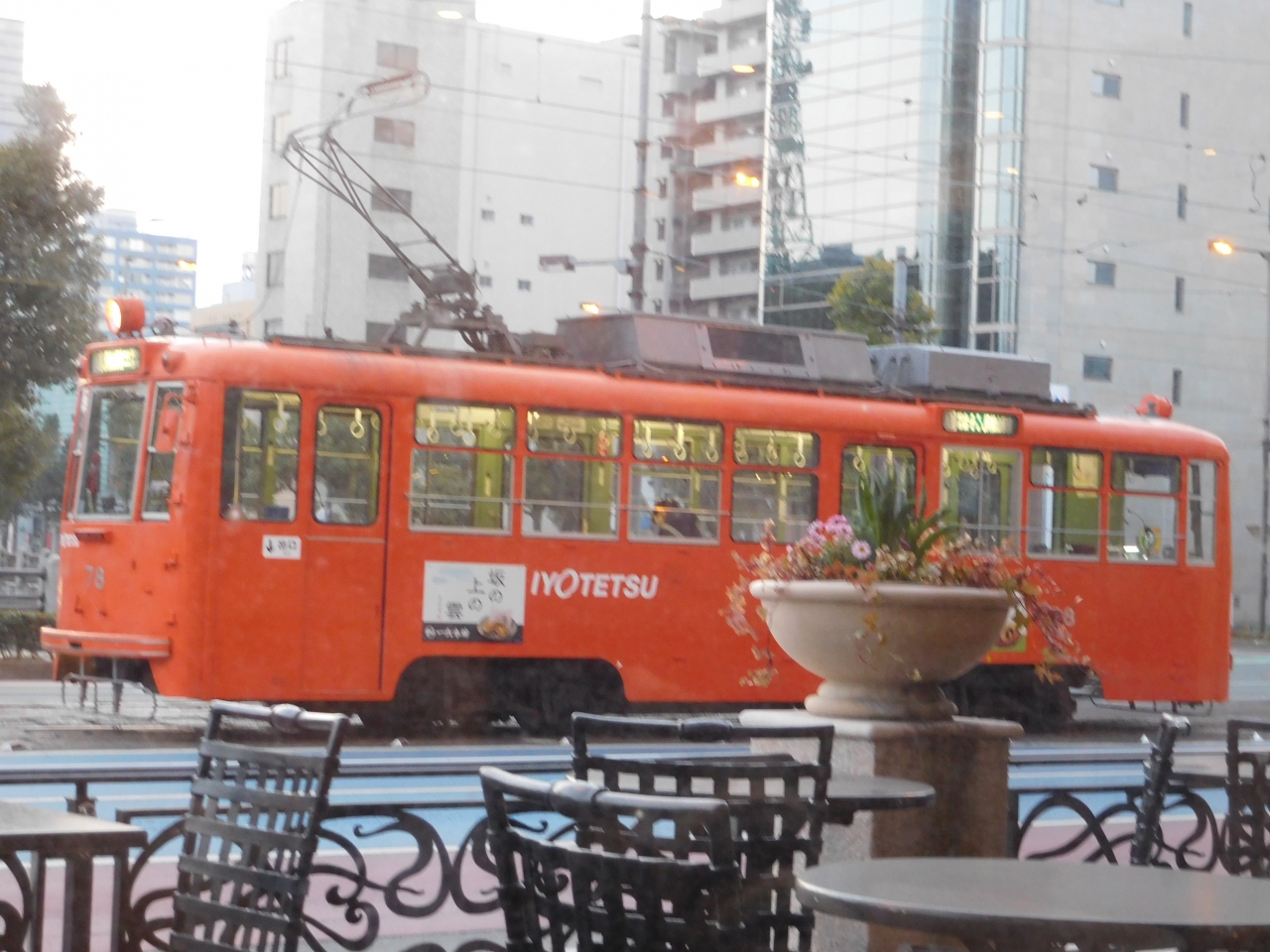 松山市内から道後温泉方面などに行く場合に便利な交通機関です。道路に線路が引かれた路面電車で、ガタンゴトンとのんびり車窓を楽しみながら乗る事が出来ます。オレンジ色の車体が多かったですですが、みきゃんのラッピング車両も走っていました。一両だとバスが走っているような感じでした。