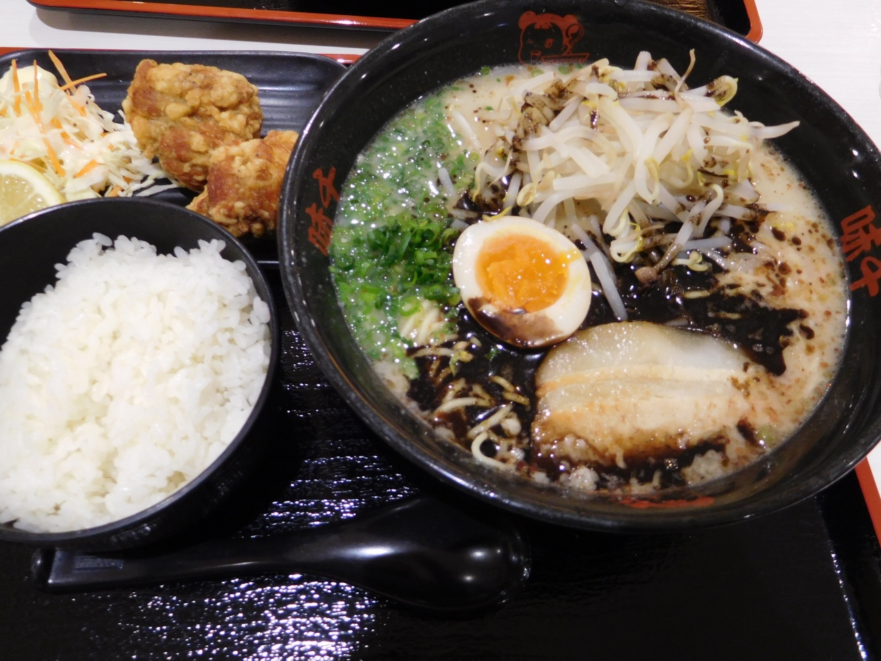 イオンスタイル松山の1階、フードコートの中にあるお店です。赤を基調としたお店で、くまモンが熊本をアピールしていました。黒マー油ラーメンに、ご飯と唐揚げを付けたセットにしました。注文すると、呼び出しベルが渡され、出来上がると取りに行くシステムです。濃厚な豚骨スープのラーメンで美味しかったです。フードコートなので、気軽に利用出来て良かったです。