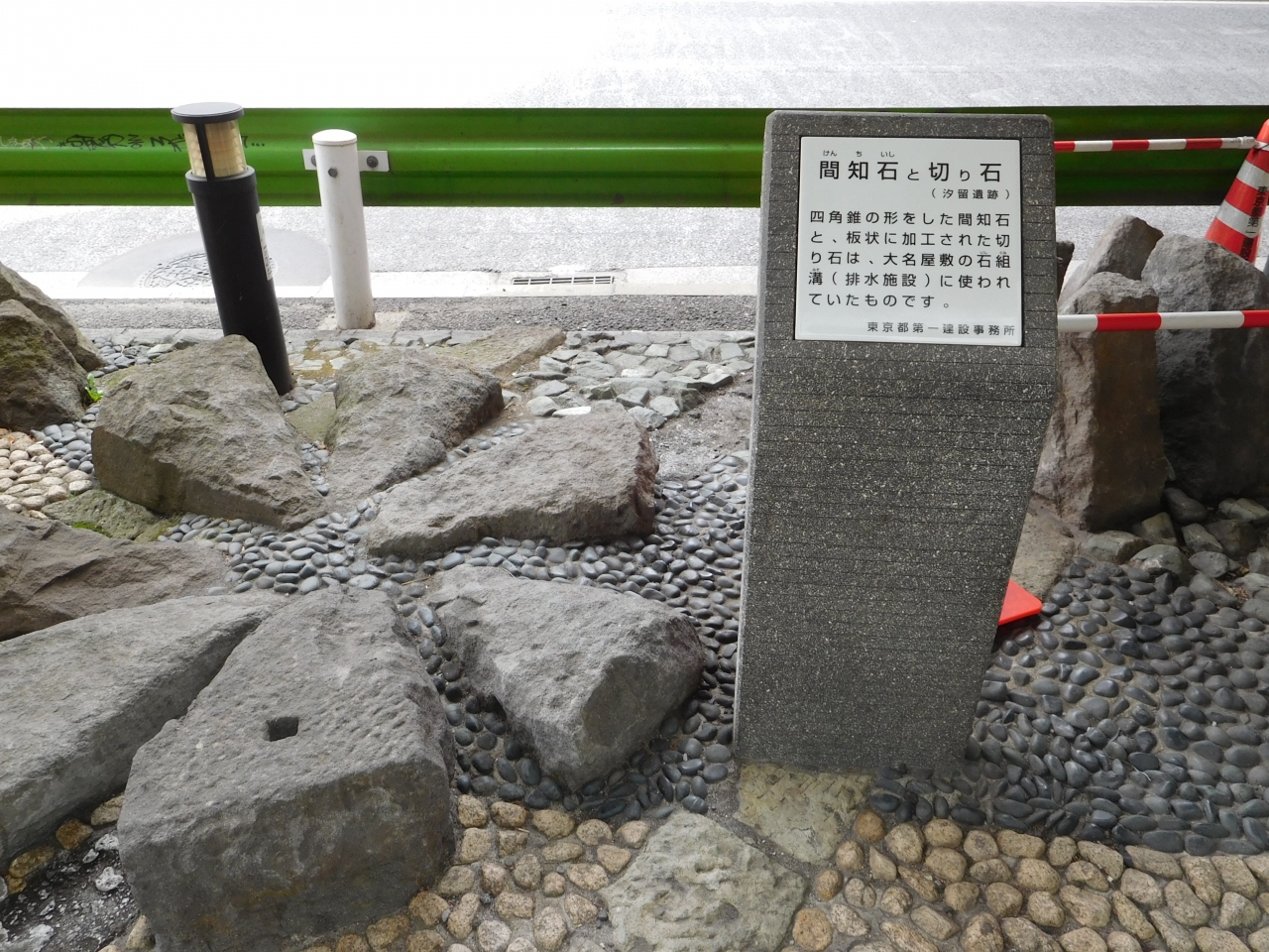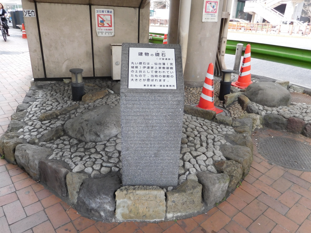 銀座東七丁目の交差点に架かる歩道橋の銀座8丁目側の階段を降りてすぐの場所にありました。銀座周辺の地図を見ていた所、「汐留遺跡(建物の礎石)」と表示があったので、気になって見に行きましたが、説明板が無ければ、全く気付かないような場所でした。交差点を挟んで丁度斜め向かい側には、「間知石と切り石」がありました。