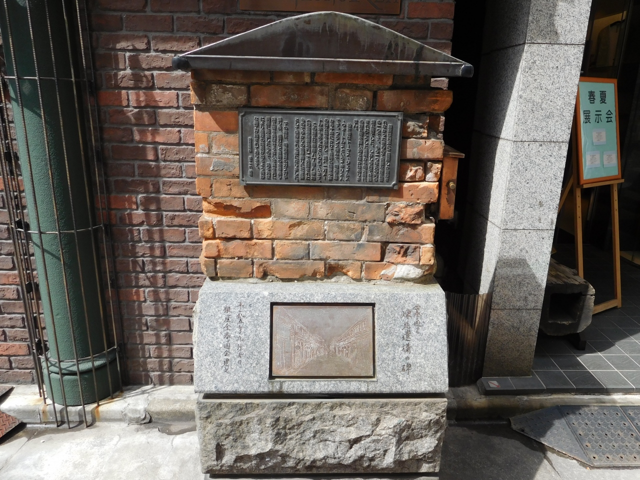 銀座ナイン-2のある御門通りから、金春通りに曲がってすぐ左側にありました。後ろの赤身を帯びたレンガ色の壁とは異なって、黄土色のレンガの碑に屋根が付いていて、郵便ポスト?なんだろう?と気になって、近くまで見に行きました。明治時代の銀座にあったレンガ街のもので、発掘されて出て来たのを記念碑としているようです。ひっそりとした場所にありますが、銀座の思いがけない歴史の一面が見れました。