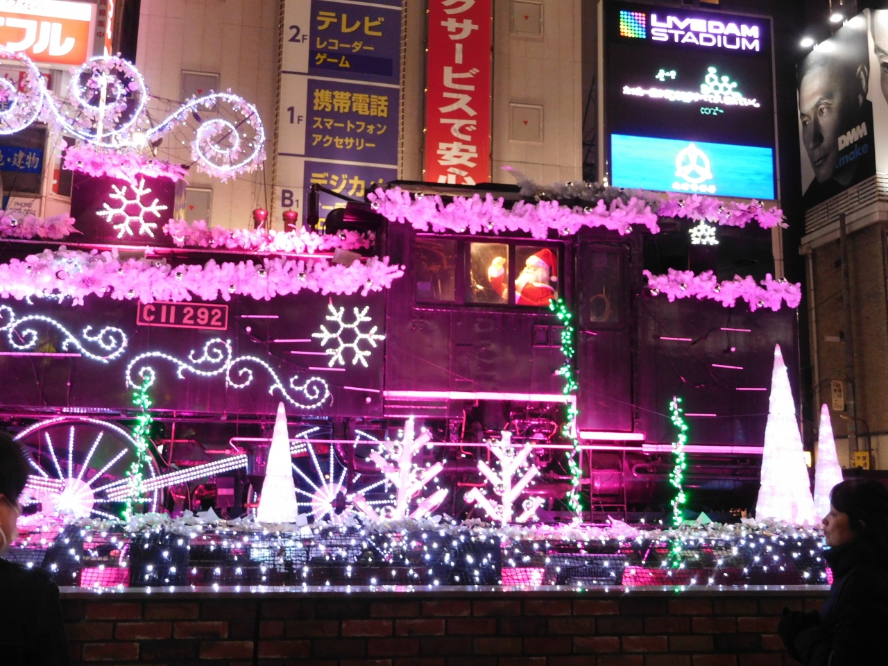 JR新橋駅前にあるSL広場(SL)のイルミネーションです。いつも騒がしい雰囲気のSL広場ですが、この時期は更にクリスマスの音楽も加わり、より一層、ごちゃごちゃ感が増していました。音楽によって色が変化するので、写真を撮ってすぐ立ち去るような人が多かったです。