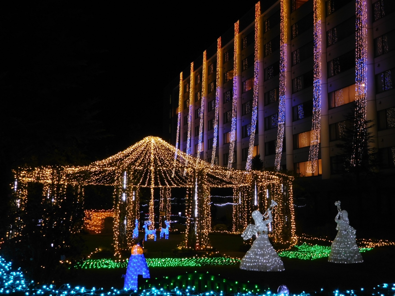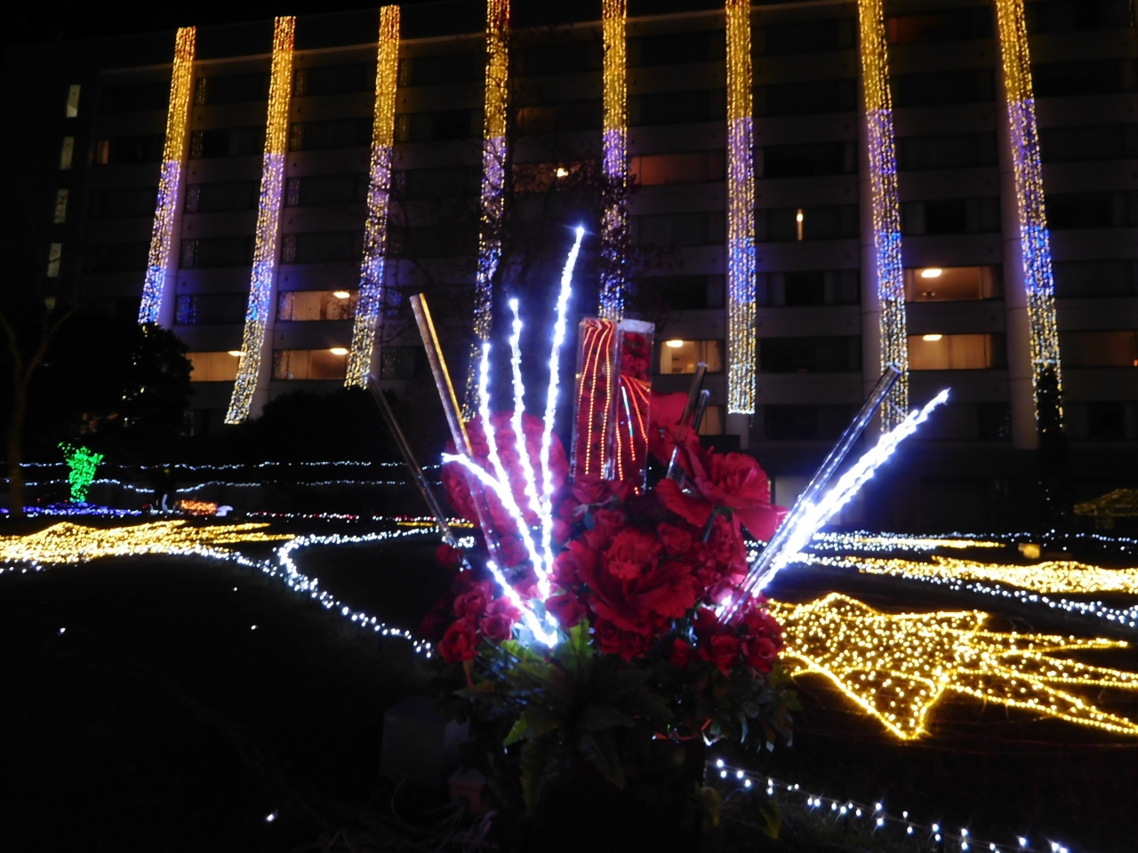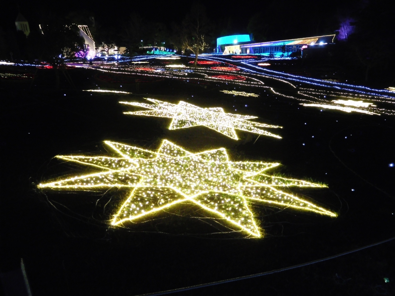 つま恋の中にある、ホテルノースウィング前に広がる敷地でイルミネーションが見れ、洋楽や邦楽のBGMに合わせて、イルミネーションの色やデザインが変化していくようになっていました。バラや星など、いろいろなデザインが楽しめました。前回(2年前)は、駐車場からシャトルバスでの移動となり不便でしたが、今年は、会場のすぐ近くに車を停める事が出来て良かったです。11月だったので、まだ人が少なく、ゆっくりと見る事が出来ました。