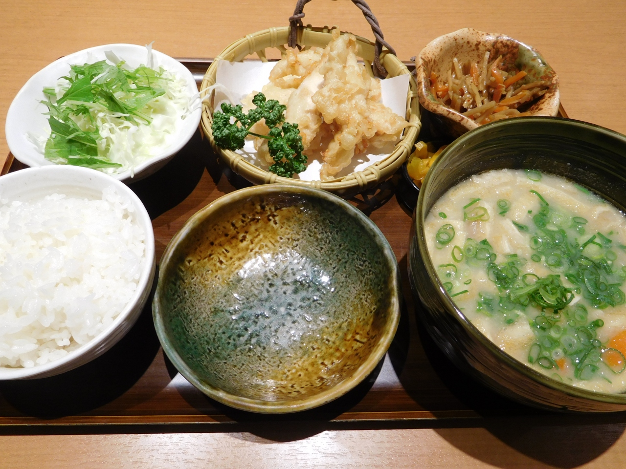 階段を上がった2階にあるお店です。落ち着いた和の空間の広がるお店で、テーブル席の他に、個室もありました。ランチタイムは、全て¥880のメニューとなっていて、サラダ、小鉢、お新香、けんちん汁も付いていました。期間限定のメニューを注文しましたが、とても満足感のある内容で美味しかったです。
