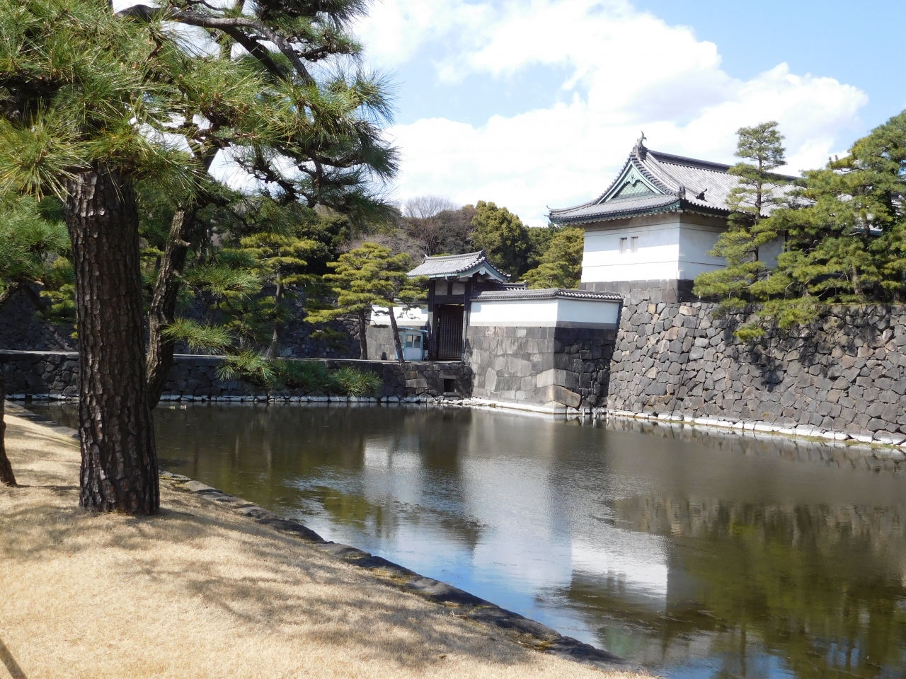 東南の角にある「巽櫓」を眺めた後、お濠沿いに奥の方へと歩いていくと、桔梗門の前にある「桔梗門橋」が見えました。橋の入口は閉鎖されていて、一般の観光客は橋が渡れないようになっていました。その為、手前側から眺める事しか出来ませんでしたが、橋も石垣で出来ていて、お濠全体が石垣で囲まれているようになっていたのが印象的でした。