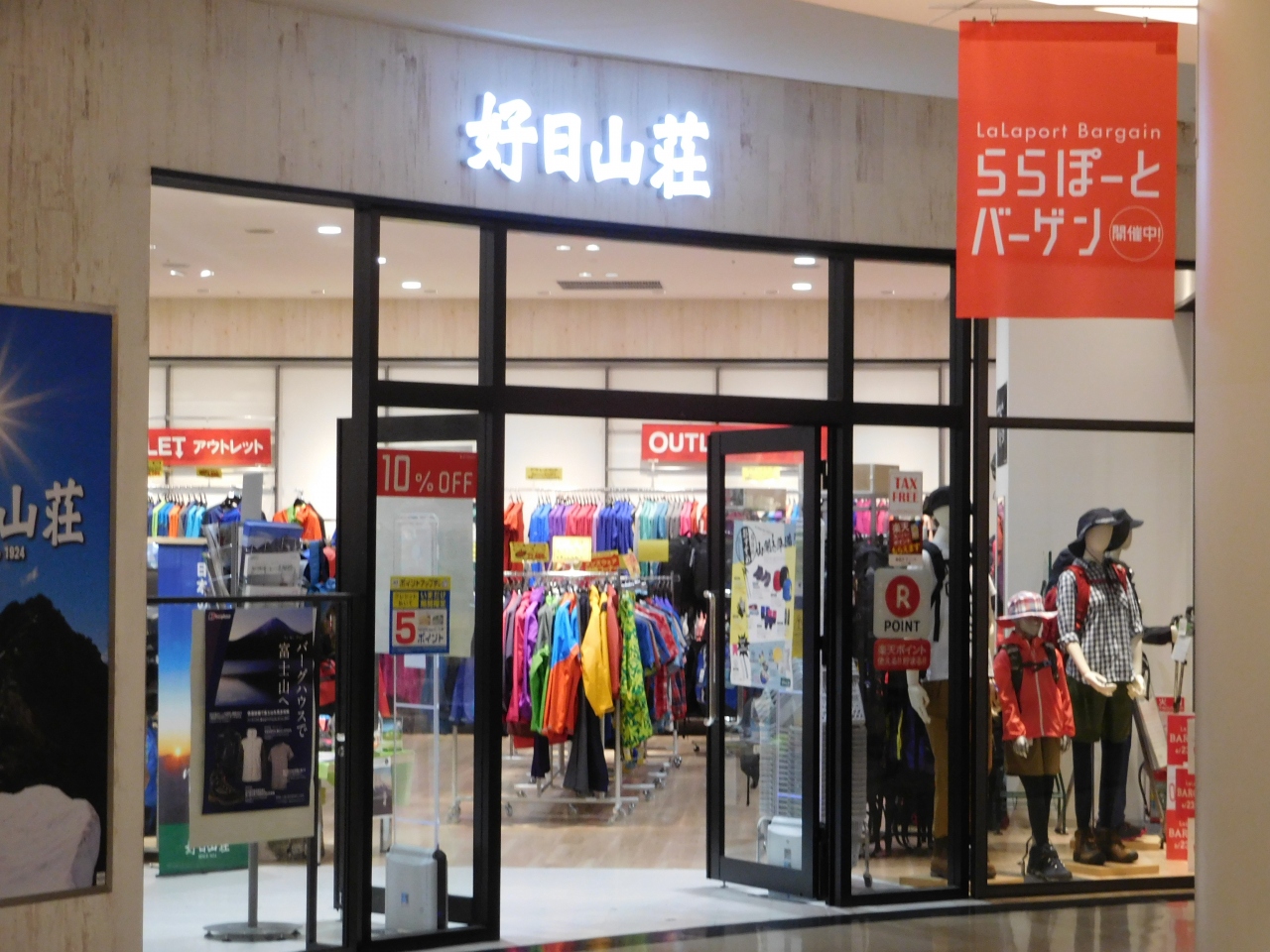 ららぽーとTOKYO-BAY 南館3階にある、登山用品やアウトドア用品のお店です。ちょうどバーゲンセール中だったので、軽く見るつもりで店内に入って見ました。アウトレット商品などもあり、本格的な登山とまでいかなくても、ちょっとした旅行で使えそうなウェアが安くなっていたので、良かったです。