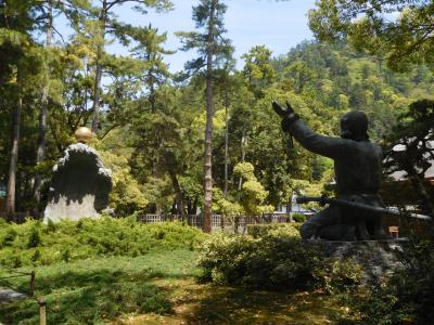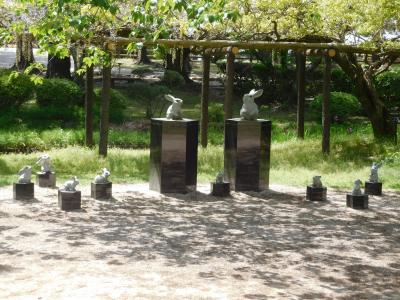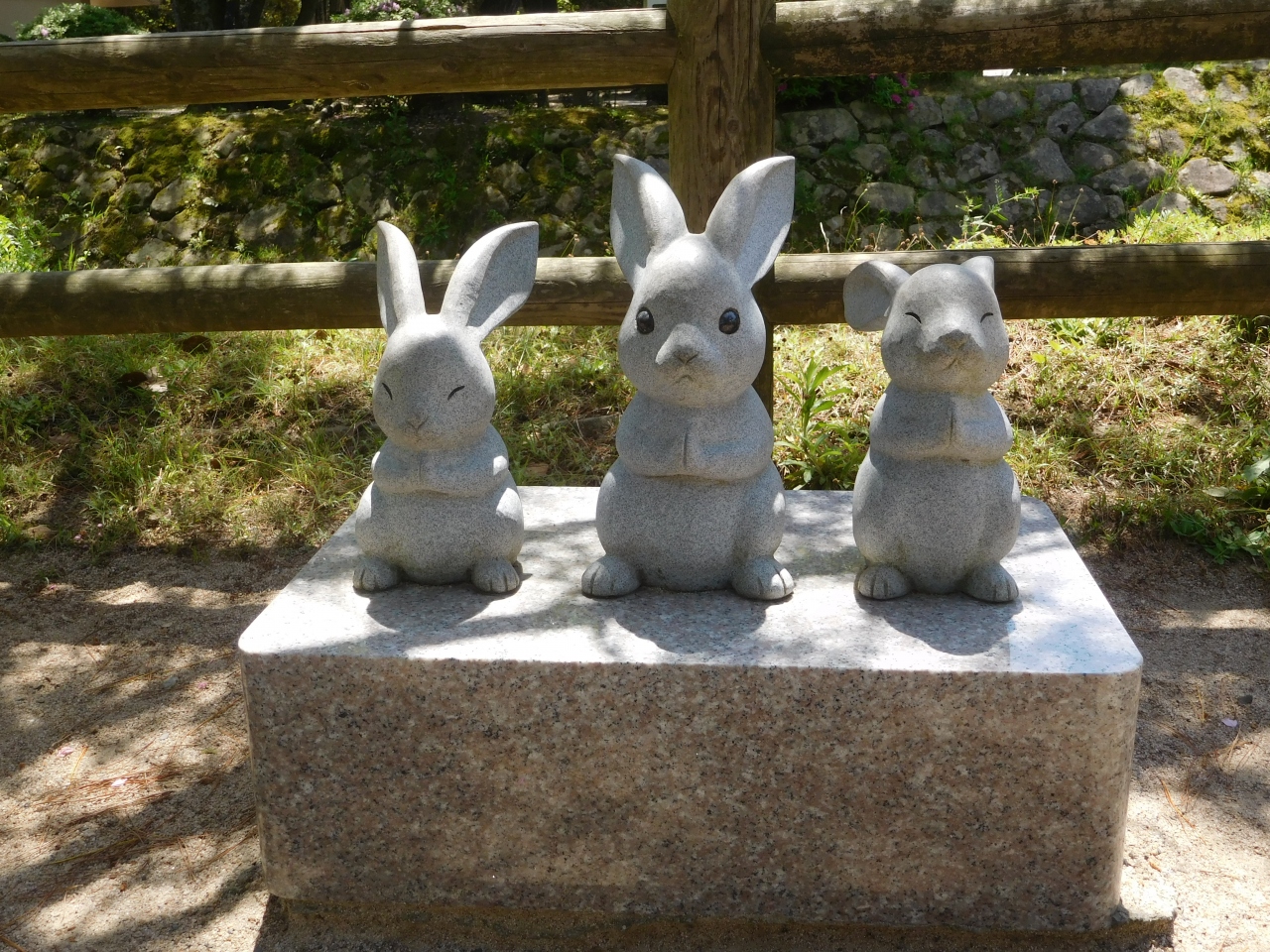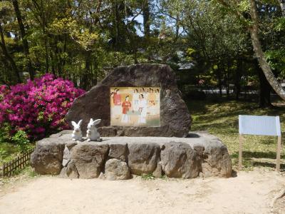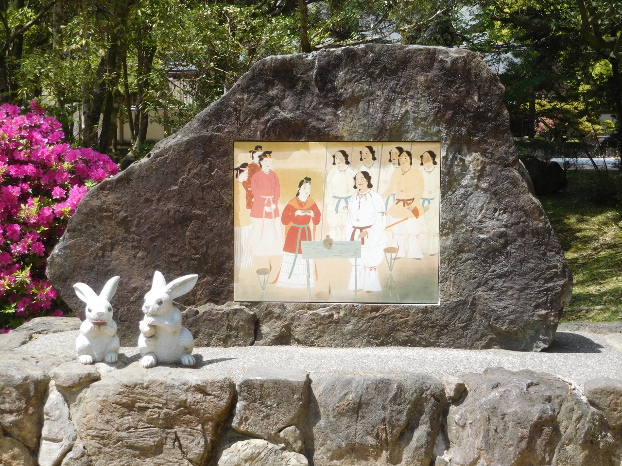 出雲大社での参拝を終え、大社内に点在しているウサギの石碑を追いながら戻る途中、松の参道の西神苑にて、「縁結びの碑」を見つけました。石碑には、大国主大神と勢理毘売神が契りの盃を交わしている絵が描かれ、その前にいる2匹のウサギも同様に、盃を交わしていてとても可愛らしかったです。