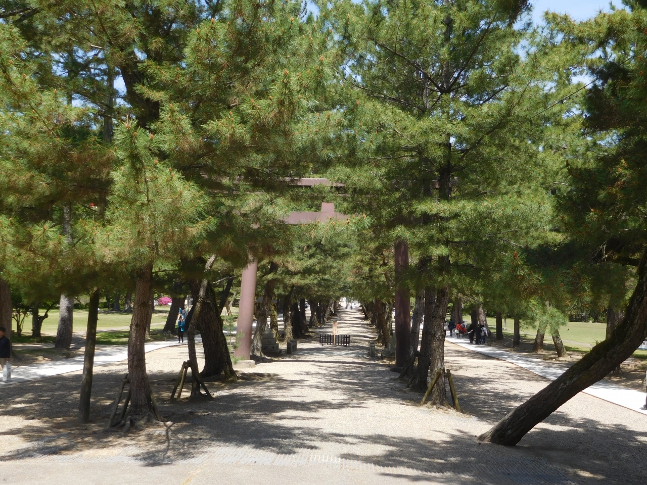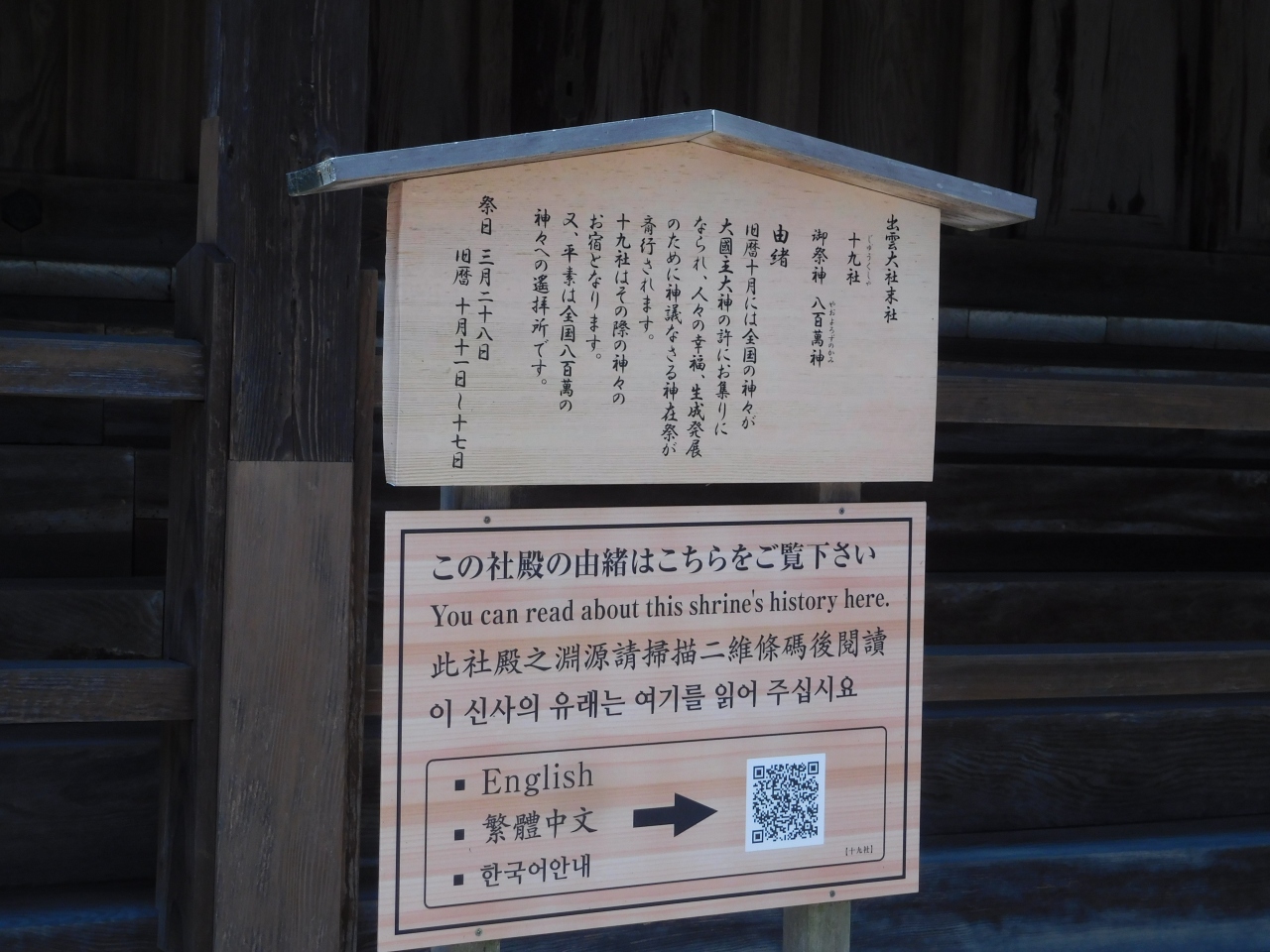 出雲大社 御本殿に向かって、東側と西側にそれぞれ十九社があります。旧暦10月に全国の神々が集まり、神在祭が斎行される際、その神々のお宿となるようです。他のお社と比べると、黒っぽく落ち着いた雰囲気になっていました。かなり広く感じましたが、全国から集まる神々には手狭ではないかなとも感じました。