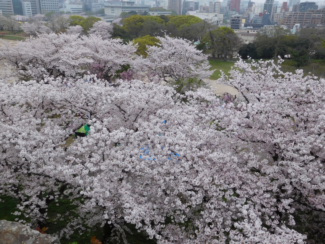 舞鶴公園内に福岡城跡があります。現在は天守閣は残っていませんが、櫓の一部と石垣などを見る事が出来ます。ちょうど、さくらまつり開催の時期に訪れたので、天守台からは、公園内に咲く見事な桜の景色を見る事が出来ました。さくらまつり期間中は、歴史的建造物公開を行っている場所がいくつかあり、無料で内部を見学する事も出来ました。「(伝)潮見櫓」、「下之橋御門」、「旧母里太兵衛邸長屋門」の3か所、見学する事が出来ました。結構、見所が多かったです。