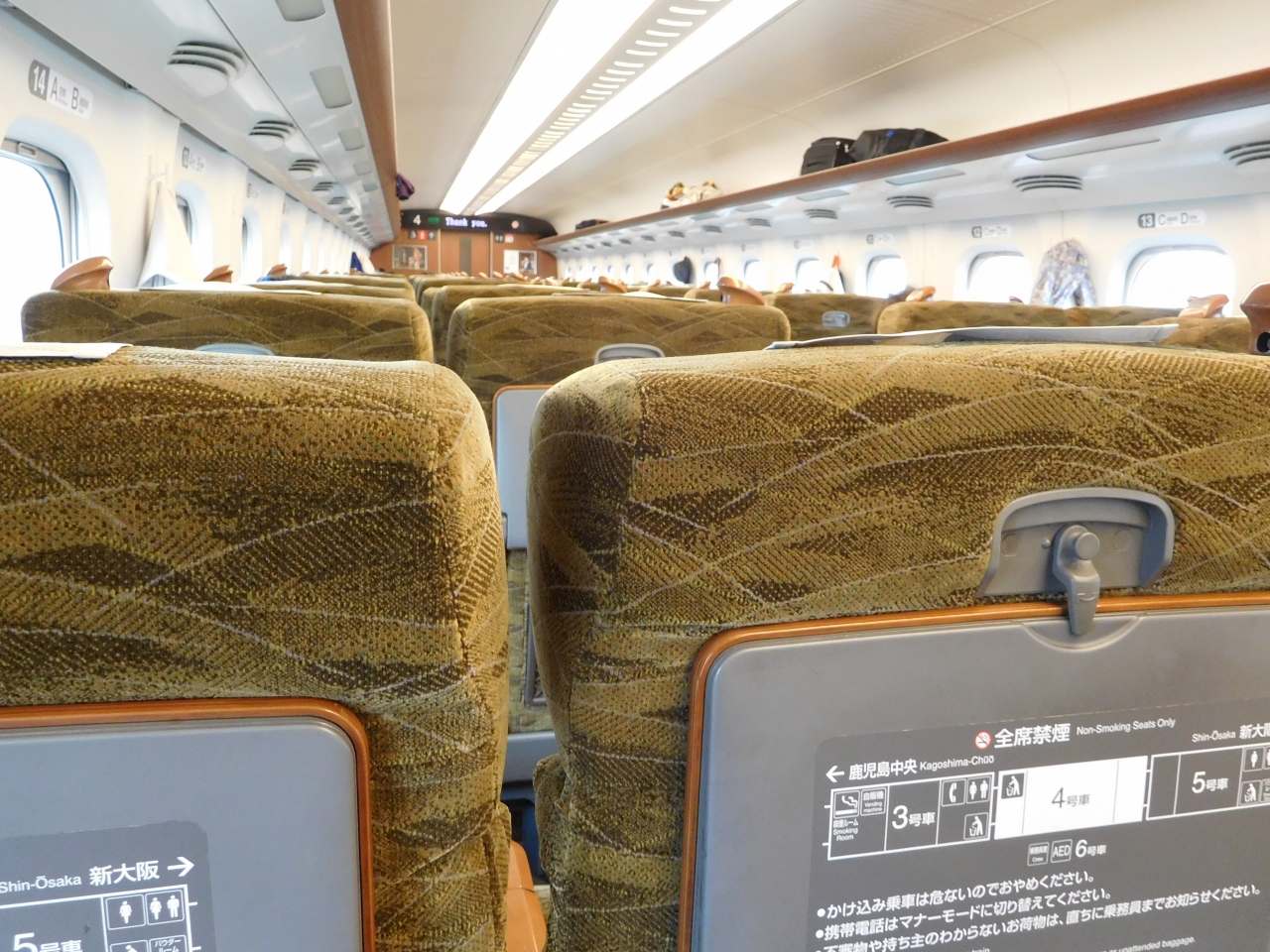 新大阪駅から鹿児島中央駅までの区間を走る、九州新幹線です。8両編成で、普通車の指定席は、2列×2列の配列なので、落ち着いた雰囲気で、ゆったりと過ごせて良かったです。また、ひじかけ部分にドリンクホルダーがあり、ペットボトルなどの飲み物を置くのにちょうど良く、なかなか便利でした。広島から博多間で利用しましたが、結構、海外からの観光客も乗車していました。