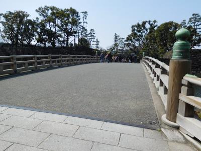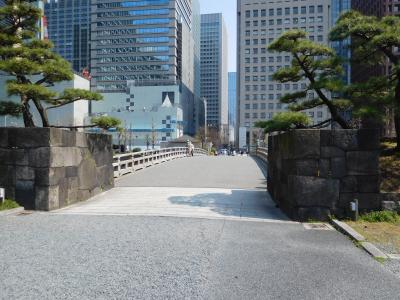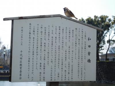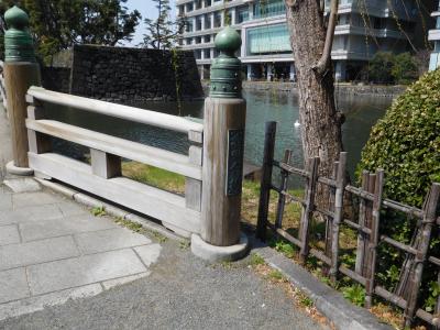 JR東京駅から皇居へと向かう際に渡る木橋です。近代的な建物が周りにある中、江戸時代の趣きのある橋がかかっていて、タイムスリップしたような感じでした。現在はコンクリートの橋ですが、往時の姿が模してあり、橋の欄干に飾られている擬宝珠は、元の橋のものをそのまま利用しているようです。信号が青になるタイミングで、東京駅方面から来た観光客が一斉に渡って行きました。橋の脇に説明板があり、その上にチョコンとスズメが乗っていて、まるでオブジェのようになっていて、すごく可愛かったです。(すぐに飛んで行ってしまったので、絶好のタイミングで写真が撮れました。)