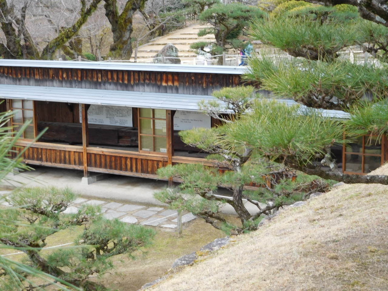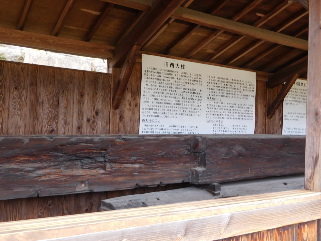 「三の丸」の一番奥側、姫路城の入城口(券売所)のすぐ手前側にあります。黒田官兵衞ゆかりの石垣方面に行く途中、石垣の上から三の丸を眺めていた時に、馬小屋のような建物が目に入り、中を覗いて見学している人もいたので、なんだろう?と気になり、行ってみると、かつて姫路城 天守閣を支えていた旧西大柱が展示されていました。この柱が長い年月の間、姫路城を支えていたのだと思うと、すごく歴史の重みが感じられました。気づかないで通り過ぎてしまう人も多いようですが、一見の価値はあると思います。