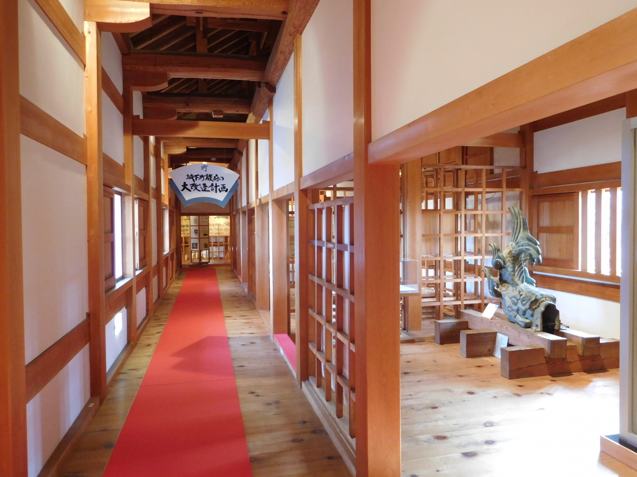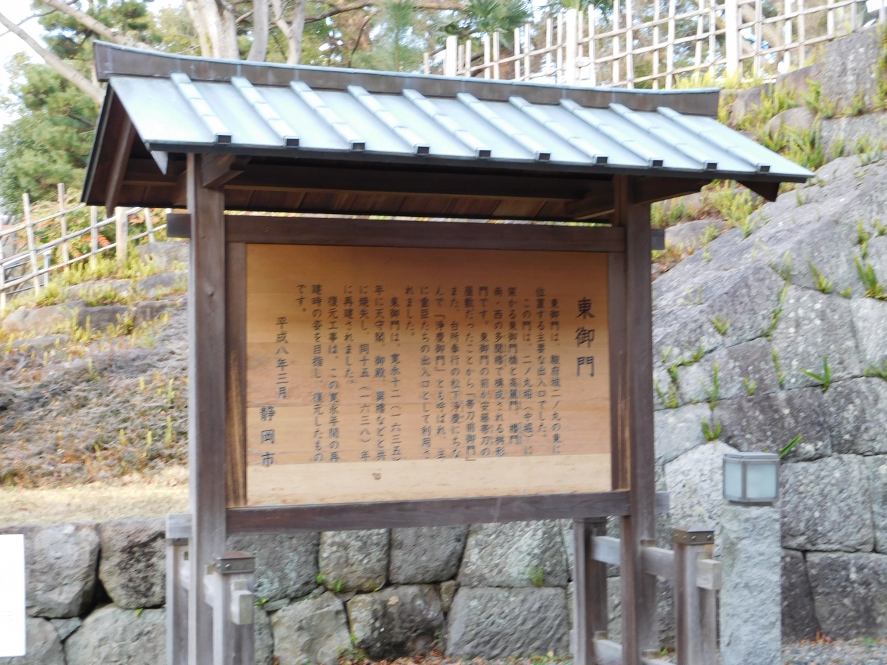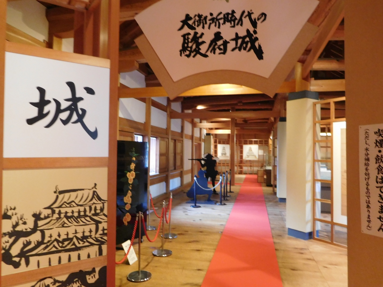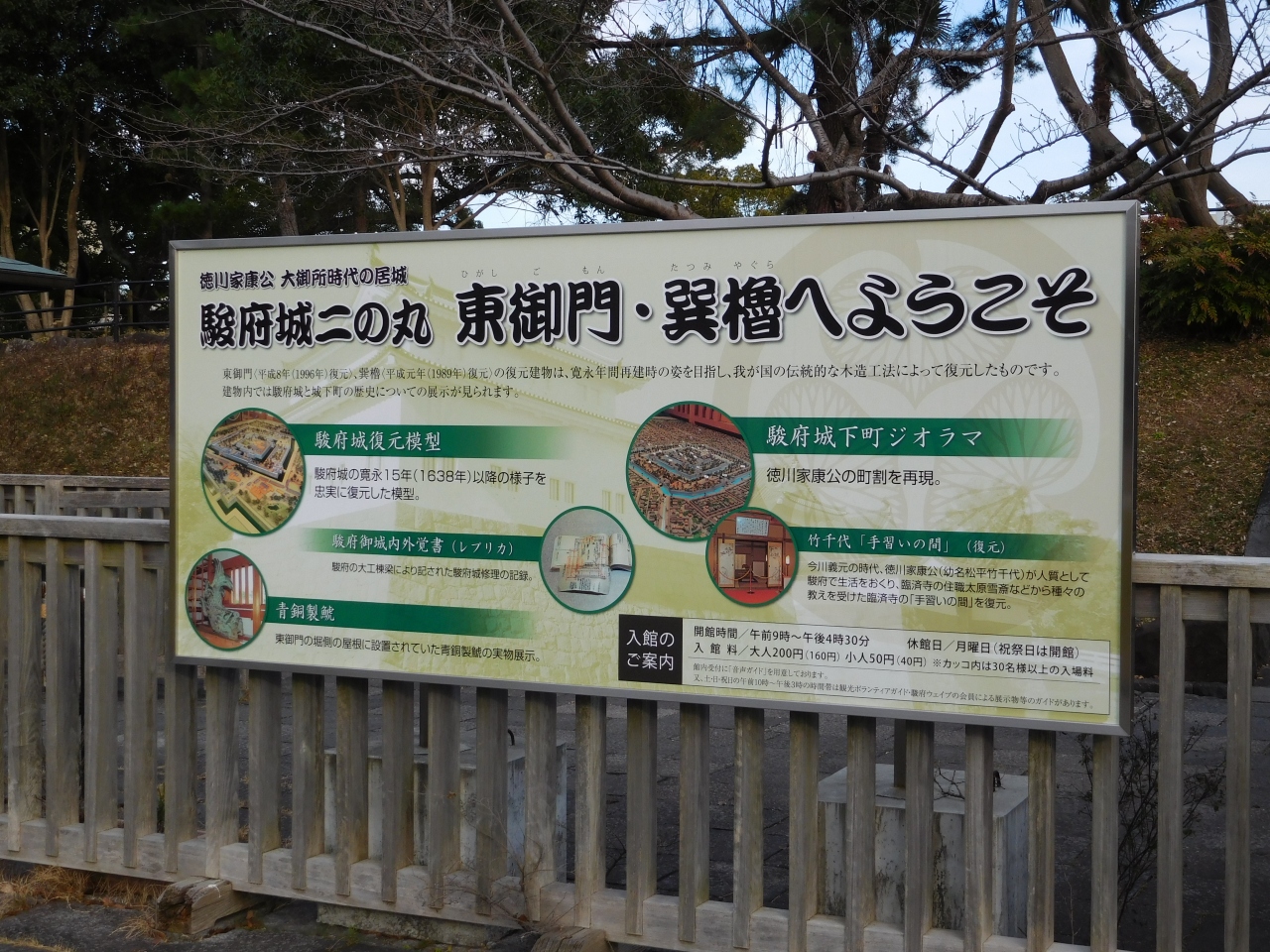 静岡駅方面に一番近いのが「東御門」で、櫓門の上にある「巽櫓(たつみやぐら)」の内部が有料(大人200円)で見学出来るようになっています。窓口に係の人がいますが、自動券売機で入場券を買うように案内がありました。入口で靴を脱ぎ、スリッパに履き替えてから、巽櫓内の展示を見学していきました。床の音がきしむ場所もありましたが、廊下(通路)から展示エリアに一歩中に入って見学するようになっていて、予想以上に、展示内容が充実していて良かったです。