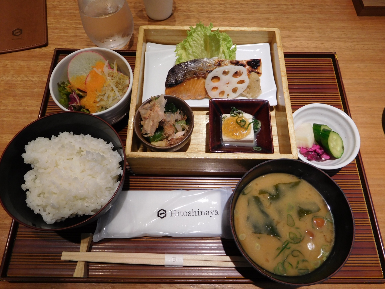羽田空港第一ターミナル 北ウィング2階、JALのチェックインカウンターのすぐ向かい側にある、和風のとても落ち着いた雰囲気のお店です。入口が3ヶ所に分かれていて、それぞれ提供メニューが分かれています。朝10時半までは、中央のお店のみが開いていて、メニューは「朝粥」と「鮭膳」の2種類のみでした。中央のカウンターに沿って、コの字型に席があり、席の後ろには、スーツケースも入る位の大きさの荷物置き場もありました。「鮭膳」を注文すると、中央のグリルで鮭を焼いている様子が見えました。お茶の代わりに、温かいお出汁と、お冷が出てきました。また、ご飯はお代わり自由でした。出発前のひとときを、ちょっと贅沢な気分で朝ごはんが頂けて、とても良かったです。支払いは電子マネー(WAON)の利用も出来ました。