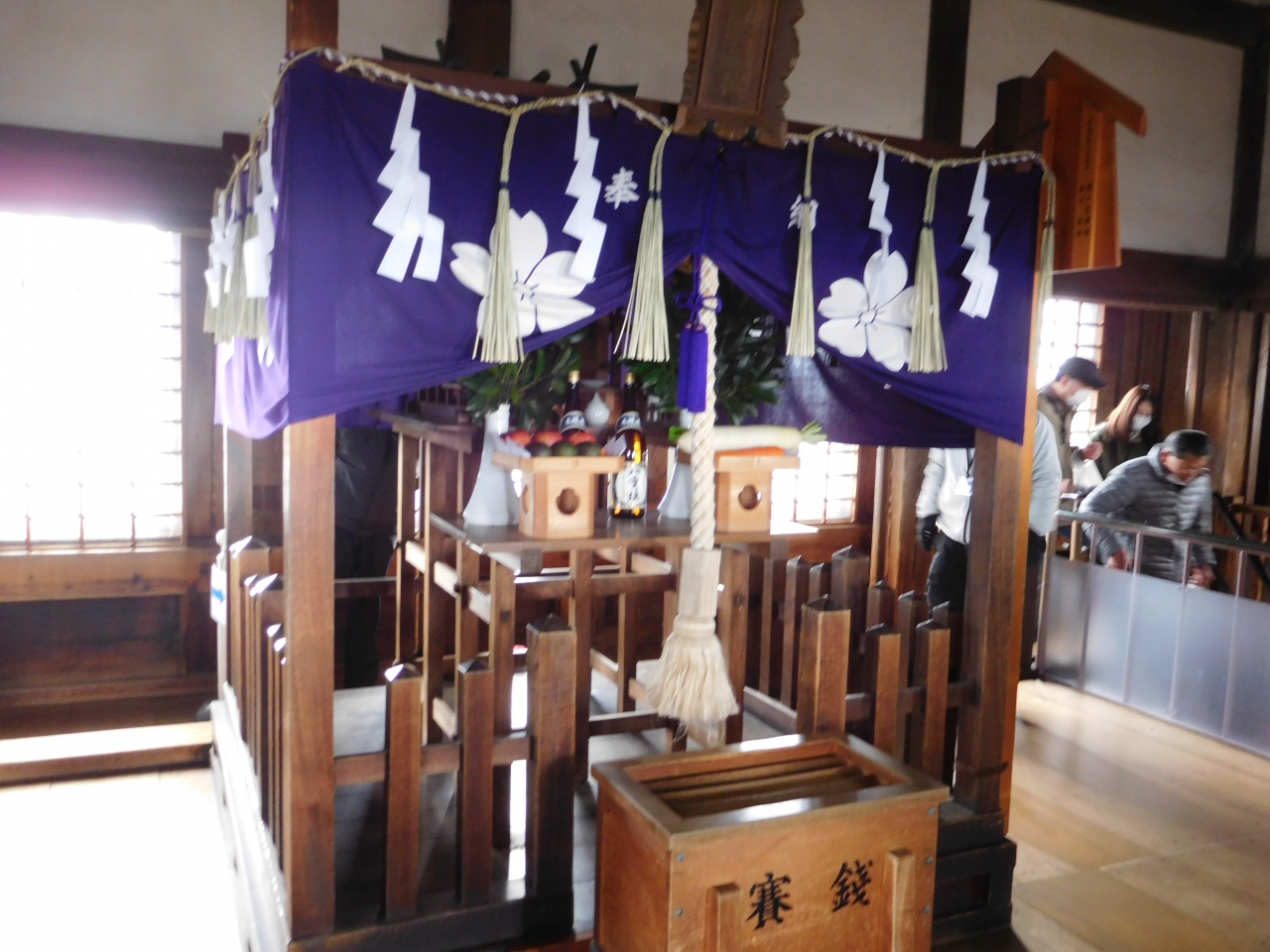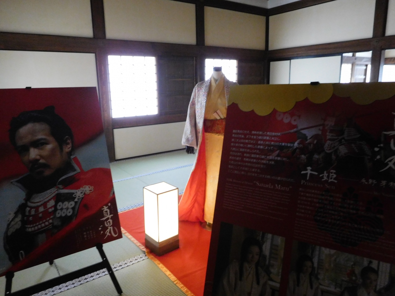 姫路城 西の丸百間廊下の最後方、出口の階段を降りる手前側(角)にあります。廊下を進んで行き、そのまま出口の階段を下りてしまうと、うっかり見過ごしてしまう位置でもありました。ちょうど期間限定で、大河ドラマ「真田丸」で使用された、千姫の衣装と、後藤又兵衛の甲冑の展示がありました。部屋の手前側では、展示を見たり写真を撮ったりする人達の列が出来ていました。