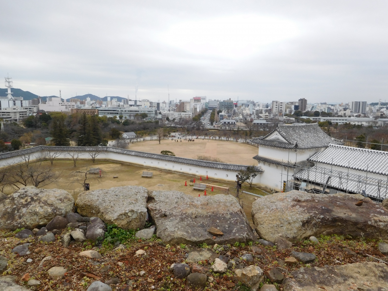 姫路城 大天守の見学を終え、外に出て来た時に広がっている広場が、本丸(備前丸)になります。大きな石垣の上に、大天守がそびえ立っている姿を眺める事が出来、多くの観光客が天守を背景に記念撮影をしていました。また、ここからは、三の丸や、大手前通りの先にある姫路駅方面まで見渡す事が出来ました。