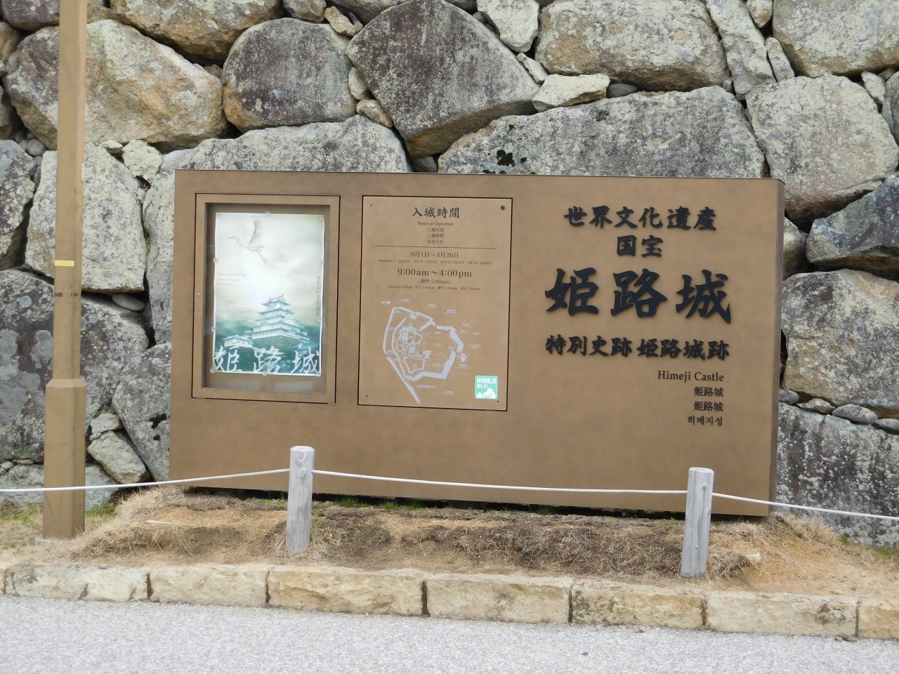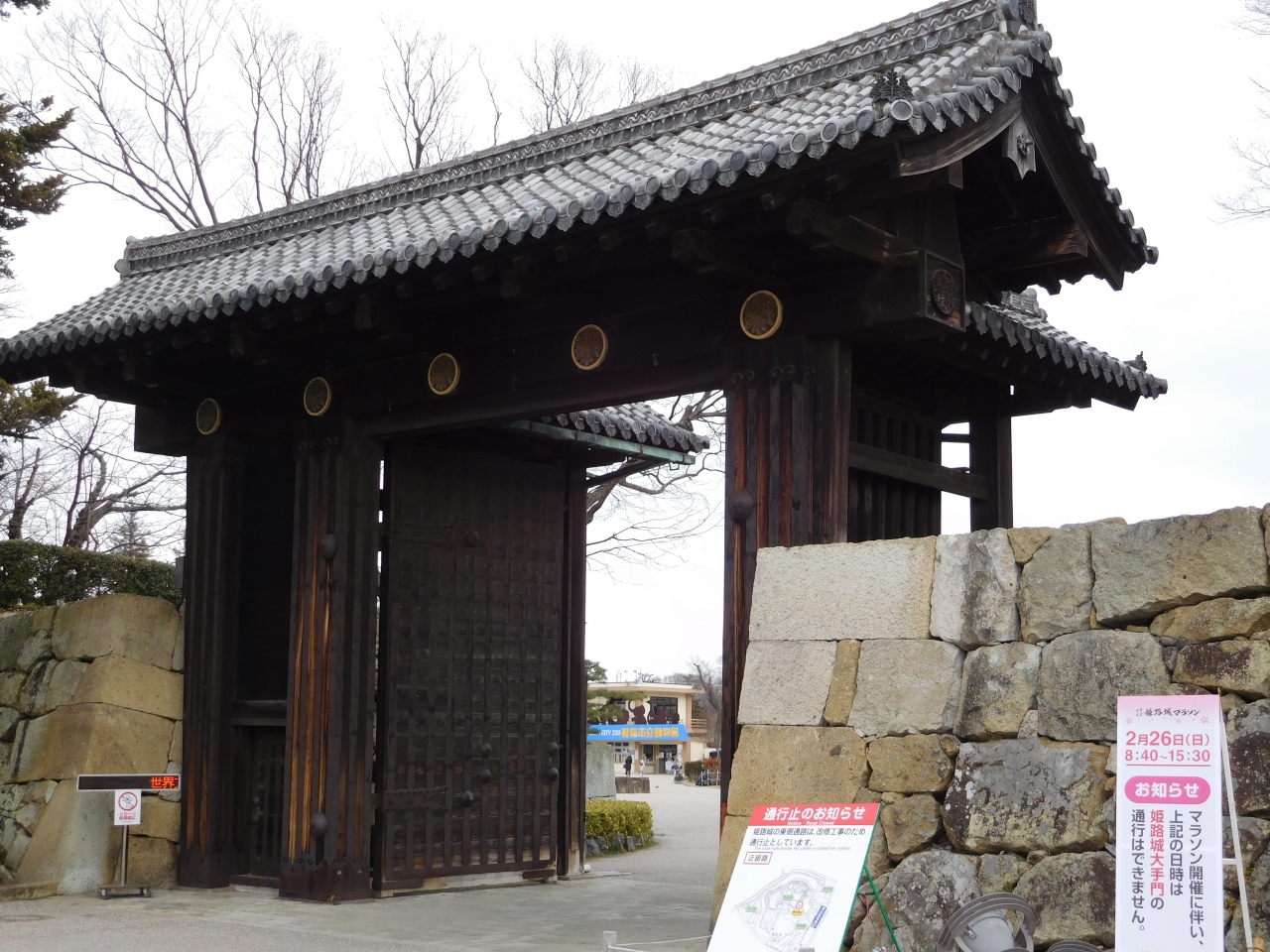 姫路城の内堀にかかる「桜門橋」を渡り、姫路城に入る際に、最初に通る門が「大手門」になります。とても重厚で、歴史が感じられるような雰囲気の門ですが、昭和に入ってから再建されたようです。門のすぐそばには、電子掲示板が置いてあり、ちょっと違和感を感じてしまいました。