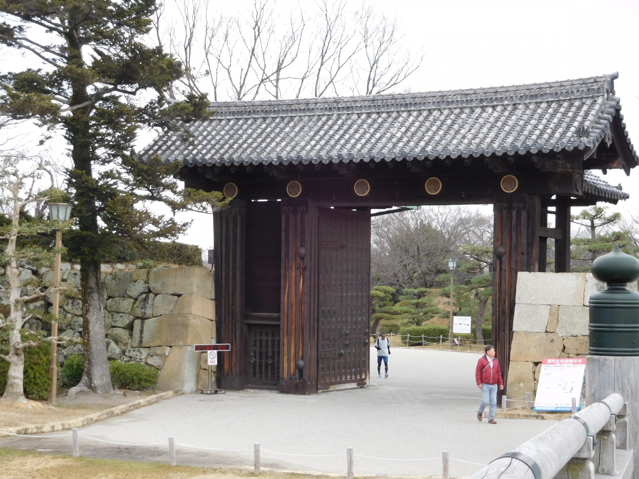 姫路城の内堀にかかる木橋で、大手門の手前側にあります。さあ、これから姫路城に入るぞ、と期待感を膨らましながら、この橋を渡りました。まだ早い時間だったので、そんなに人通りも多くなく、橋全体の写真を撮る事が出来ました。ここは無料で通れる場所なので、観光客だけでなく、マラソンをしている人の姿もありました。