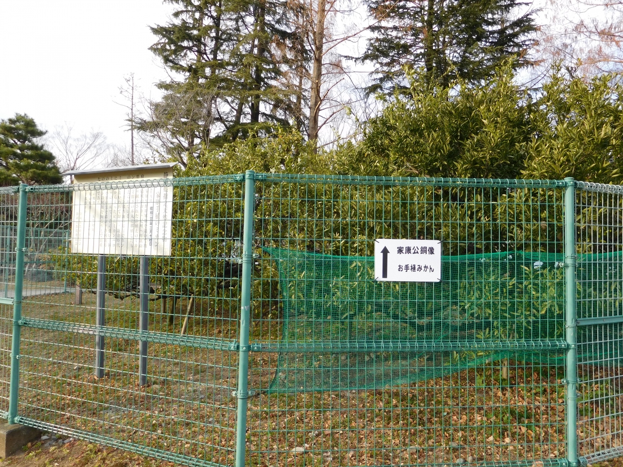 駿府城公園の本丸跡(中央付近)、晩年の徳川家康公之像の近くにあります。ぐるりと一周、厳重にフェンスに囲まれていました。(おそらくミカンが盗まれないようにしているのだと思いますが…。)今の時期は青々とした葉がついている木でしたが、どれくらいの実ができるのかも見てみたいと思いました。鎌倉時代に中国から渡来した紀州みかんの一種で、県指定天然記念物となっています。