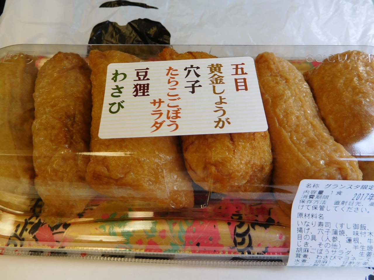 東京駅地下のグランスタで、新幹線に乗る前のお弁当探しをしていた時に、行列になっているお店があり、覗いてみると、いなり寿司の「豆狸」でした。すぐに買えるように、あらかじめパック詰めされた商品が脇に並んでいて、他にも、ショーケースの中には、いろいろな種類のいなり寿司が並んでいるので、好きなものを好きな数だけ選んで買う事も出来るようになっていました。ちょこっとだけ買いたいという場合には、とても便利で、2個や3個だけ買っている人も結構いました。折角なので、グランスタ限定の6種パックを購入しました。いろいろな味が入っていたので、飽きる事なく食べれて美味しかったです。
