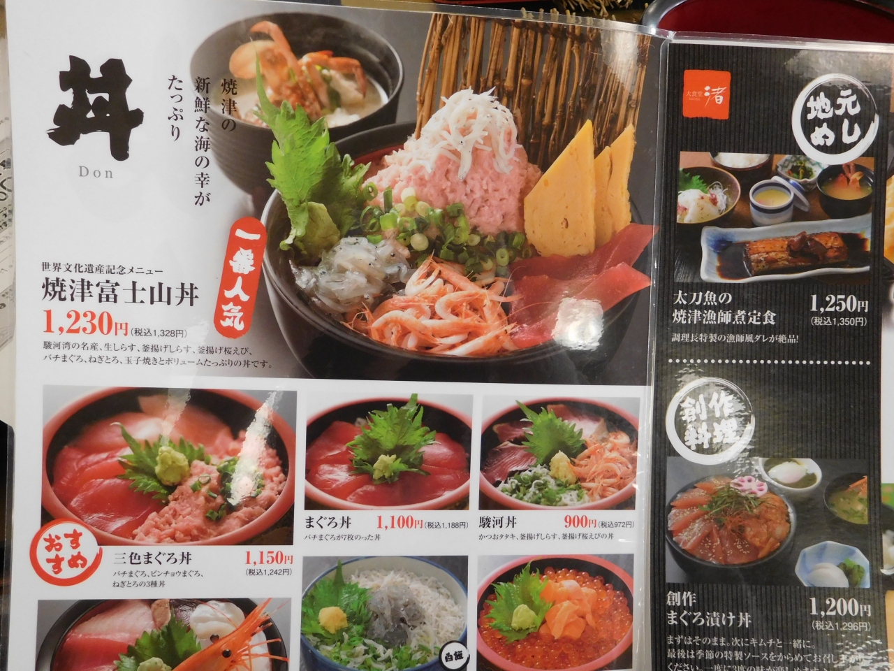 焼津さかなセンターにある大食堂です。市場の中にも食事の出来るお店はありますが、結構狭くゆっくり食事が出来なそうな感じでしたが、こちらは大食堂なので、ゆったりと食事が出来ました。席はテーブル席とお座敷があり、団体客は別のフロア(2階)になります。一番人気の「焼津富士山丼」を注文しましたが、いろいろと具が載っていて美味しかったです。また、無料でカニ汁のサービスがあったのも、良かったです。