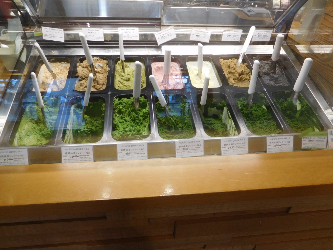 静岡駅からは少し離れた場所にある小さな店舗です。店内のショーケースの中に、濃さの違った抹茶のジェラートが並んでいました。1~7までの濃さがあり、抹茶が濃くなるにつれて、抹茶の色も変化していきます。抹茶の他にも、プレーン、いちごミルク、ほうじ茶、玄米、黒ごま、きなこクルミ、和紅茶のフレーバーがありました。コーンかカップなどを選んで注文し、会計をしてから受け取ります。折角なので、2種類の味が楽しめるよう、ダブルを注文しました。とても美味しかったので、また機会があれば、違う濃さの味も食べてみたいと思いました。店内には入口すぐの場所にイスが数脚置いてあるだけで、お店の前は、青葉シンボルロード 青葉緑地になっているので、ベンチもいくつかありました。冬の時期にも関わらず、次から次へとお客さんが入っていて、とても人気のお店でした。