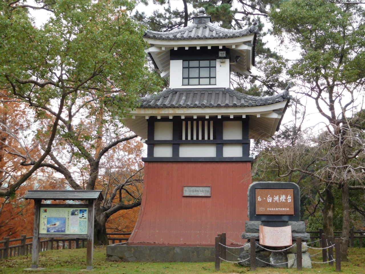 勝山公園内、松本清張記念館のすぐ左側の少し奥まった場所にありました。また、すぐ横には、船の遭難が絶えない小倉藩沖の海の難所から船を守る為に、私財を投げ打って灯台建設に尽力をつくした岩松助佐衛門の解説が分かりやすく書かれていました。遠くから見た時は、一瞬、小倉城のミニチュア版かと思ってしまいましたが、こんな歴史があったのか、と勉強になりました。