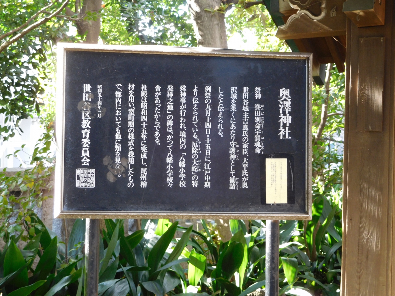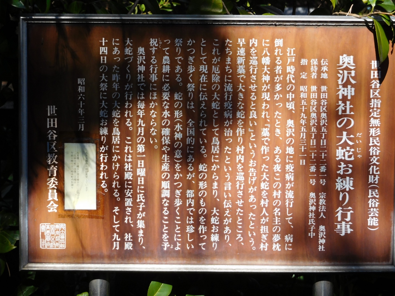 自由が丘駅南口から奥沢駅方面へと歩いて行く途中にあります。道路からすぐの場所に、奥澤神社の入口があり、鳥居には藁で出来た大蛇が飾られていました。大きな目が印象的で、訪れたのが1月だったので、新年の行事でもあったのかな、と思いましたが、毎年9月に行われる「大蛇お練り行事」に使われるようです。自由が丘の神社と言えば、熊野神社が有名ですが、同じく自由が丘駅から徒歩圏内に、こんな貴重なお祭り(世田谷区指定無形民俗文化財)のある神社が存在していた事を知らなかったので、驚きました。
