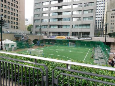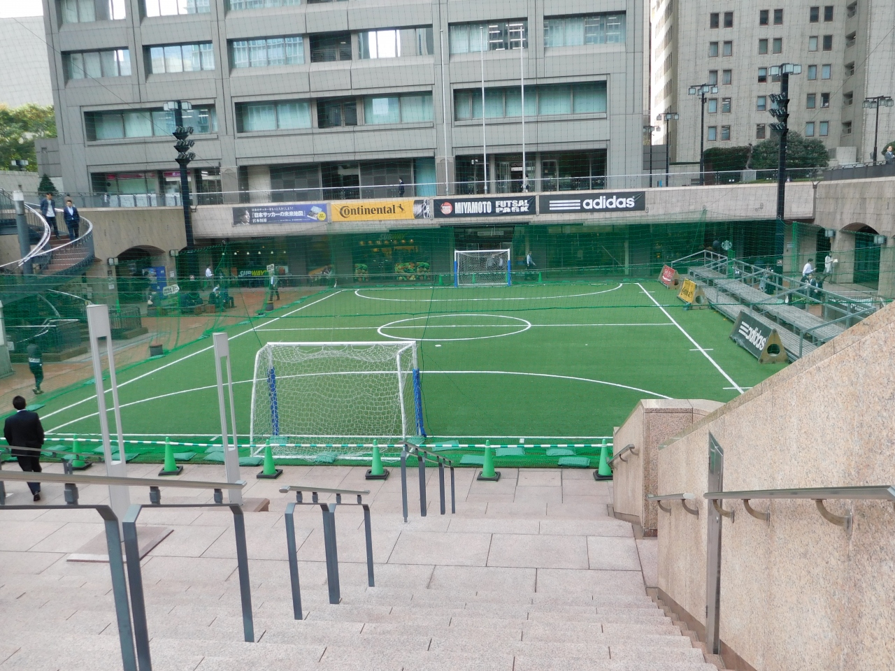 日比谷シティの、日比谷通り側にある広場です。階段を下りたB1Fフロアに、ネットで囲まれた「MIYAMOTO FUTSAL PARK」(フットサル場)がありました。訪れた時は平日の昼間だった為、広場はガランとした状態で、周囲のベンチで会社員が休んでいたりしました。夜になるとライトが付き、フットサルの練習が行われていたりします。ビル内には飲食店などもあるので、利用者にはなかなか便利な場所だと思います。