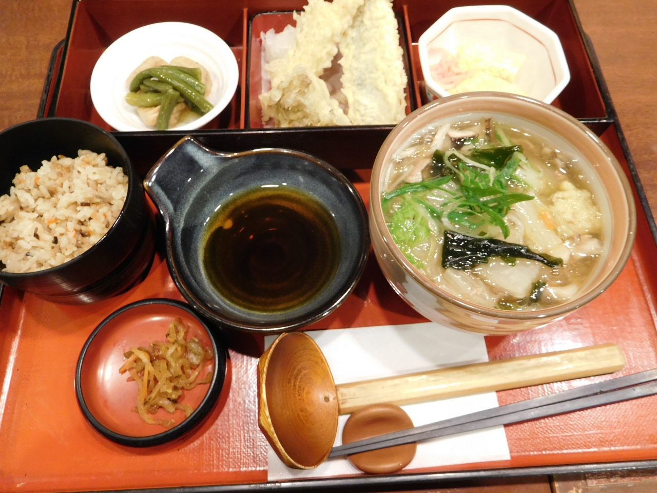 大垣駅ビルの2階にある、手打ちうどんのお店です。駅周辺は割と早く閉まってしまうお店が多く、居酒屋さんではない所で夕食が食べれるお店を探していた所、駅ビル内にこのお店があったので入ってみました。ごはん・うどん・天ぷらなどが付いた、秋限定のメニューがあったので、注文しました。セットメニューでも、割とお手頃な値段で食べれて、しかも、なかなか美味しかったです。