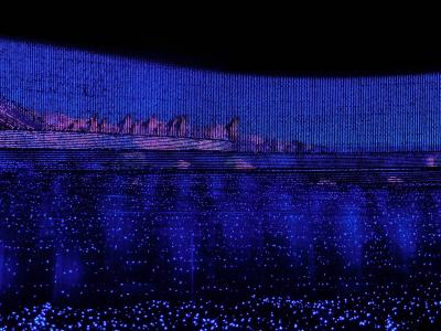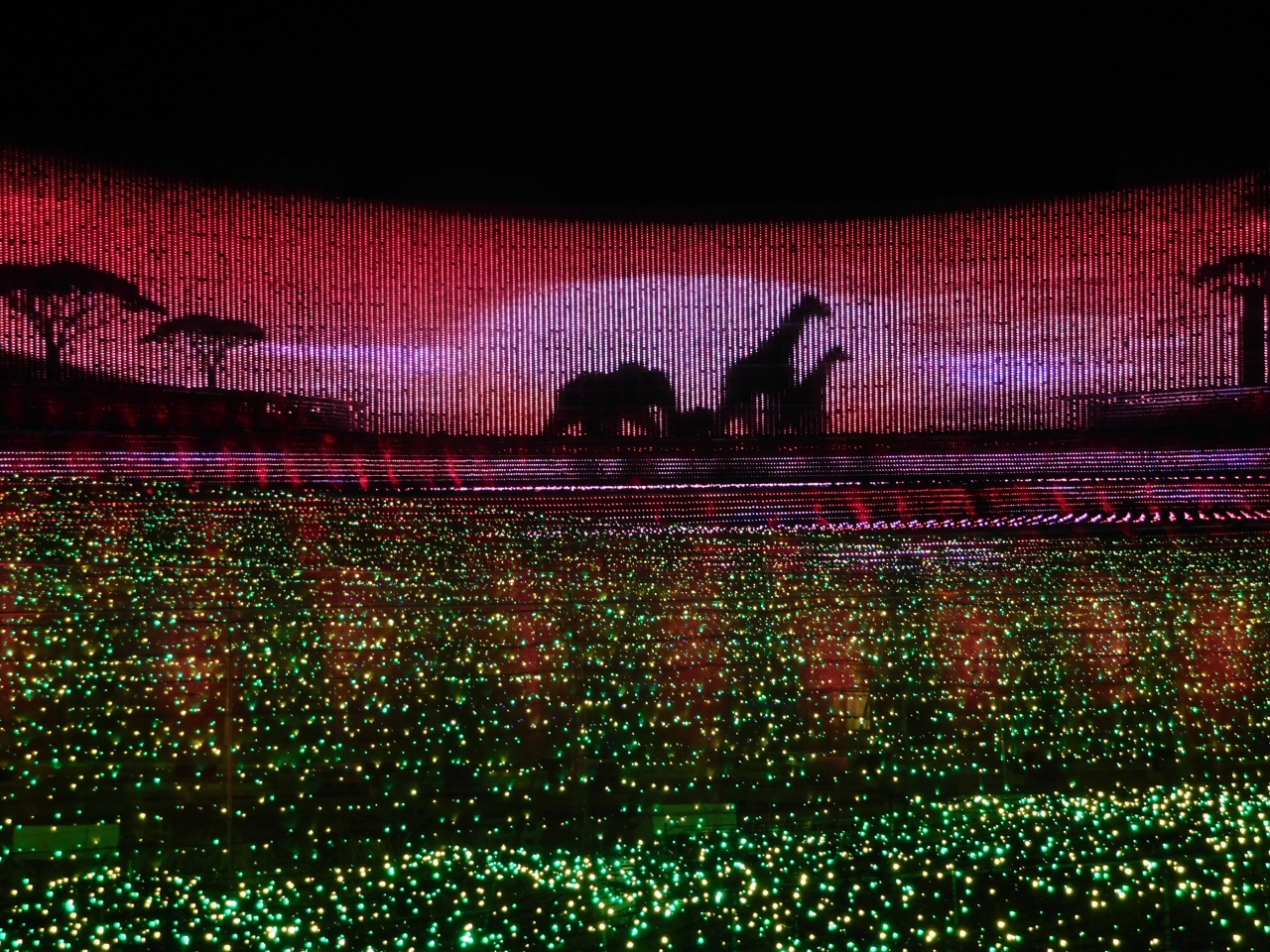 200メートルまっすぐに続く光のトンネルを抜けると、メイン会場の大きなパノラマのイルミネーションが広がっていました。2016年のテーマは「大地」で、約6分25秒で景色が一周するようになっていました。帰りのトンネルは、少し曲がりくねった形をしていて、秋をイメージし、3色に色が変化していました。鏡池の近くでは紅葉も楽しめました。平日に行ったので、割とゆっくり見る事が出来て良かったです。