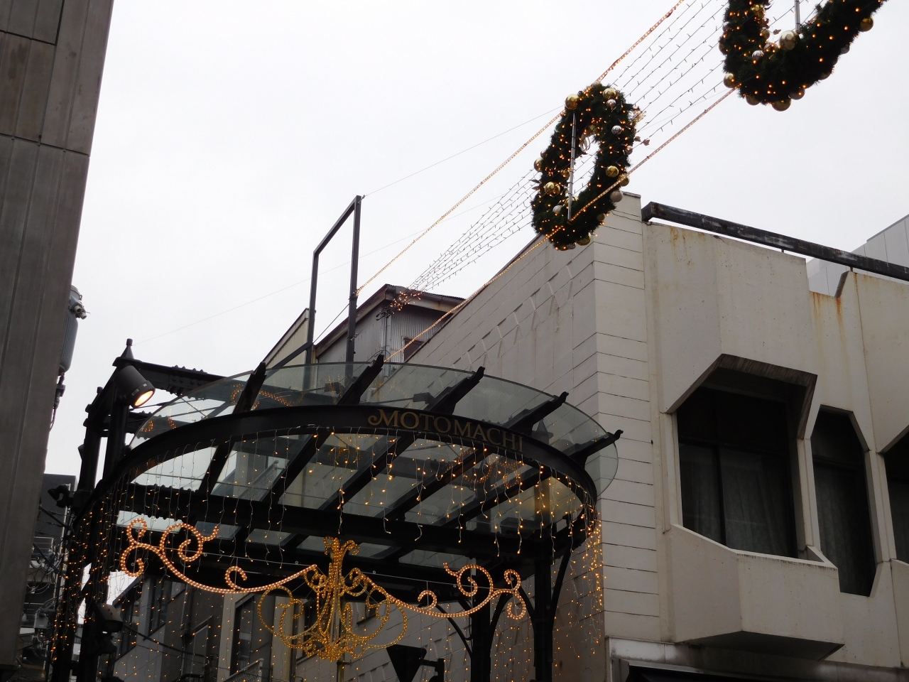 元町商店街が、クリスマスリースなどのイルミネーションの装飾で飾り付けられ、クリスマスの雰囲気になっていました。この時期になると暗くなるのが早いので、夕方にはもうライトが点いていました。平日に訪れたので、人通りもそんなに多くなく、あまりイルミネーションに目を向けている人がいなかったのがちょっと残念でした。