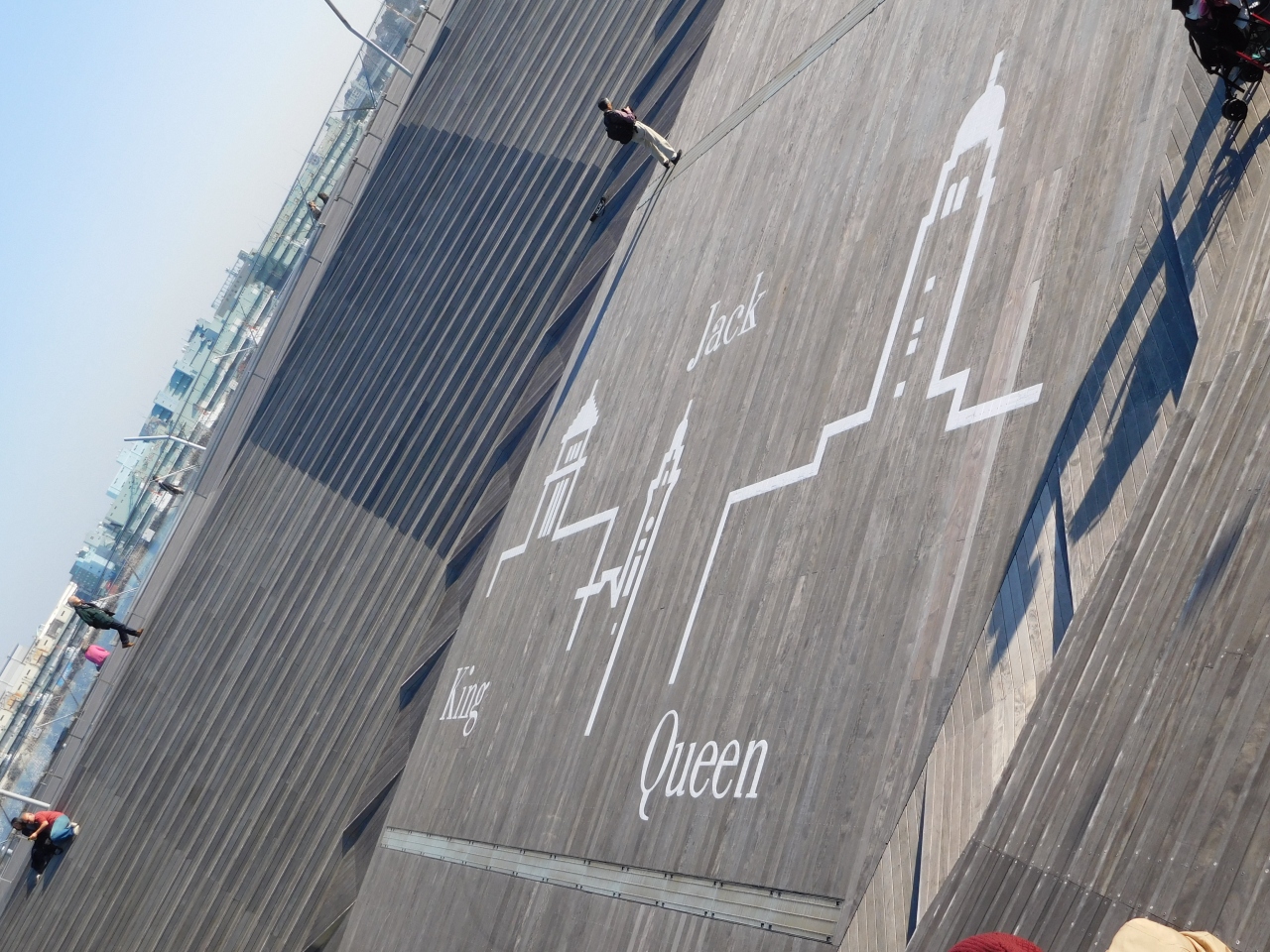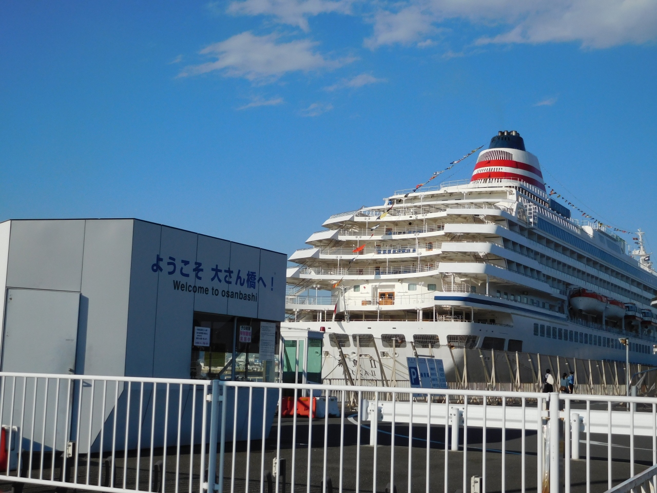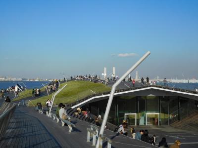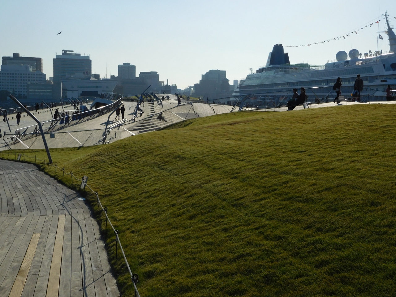 「くじらのせなか」と呼ばれる愛称がある通り、真ん中が盛り上がった形のウッドデッキが広がっていて、ここからベイブリッジやみなとみらい地区なども一望出来、とても開放的で気持ちのよい場所です。訪れた時はちょうど、大型客船「飛鳥Ⅱ」が入港していて、大さん橋を歩きながら、船を間近に見る事が出来ました。また、反対側では、ロイヤルウィングが出港するのが見えました。腰掛けて休める場所も多くあり、海風を感じながら過ごせてとても良かったです。
