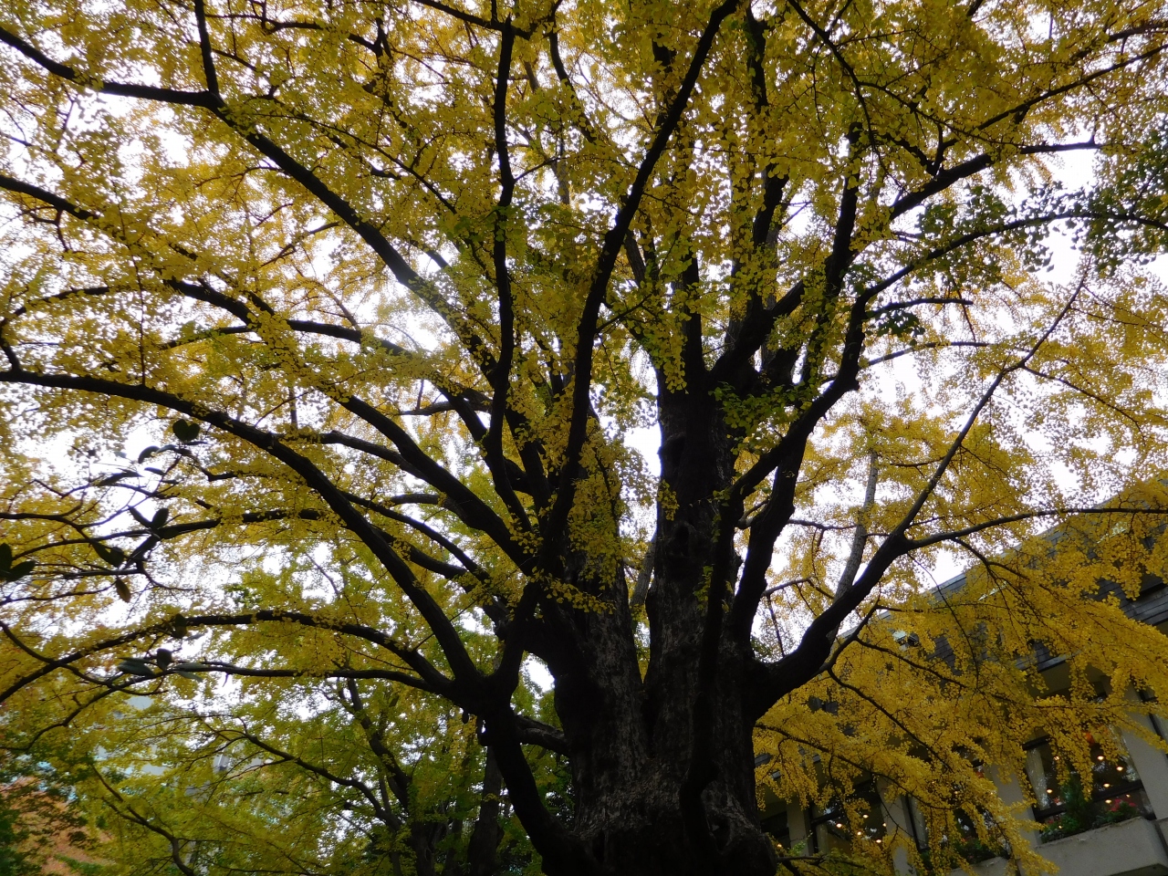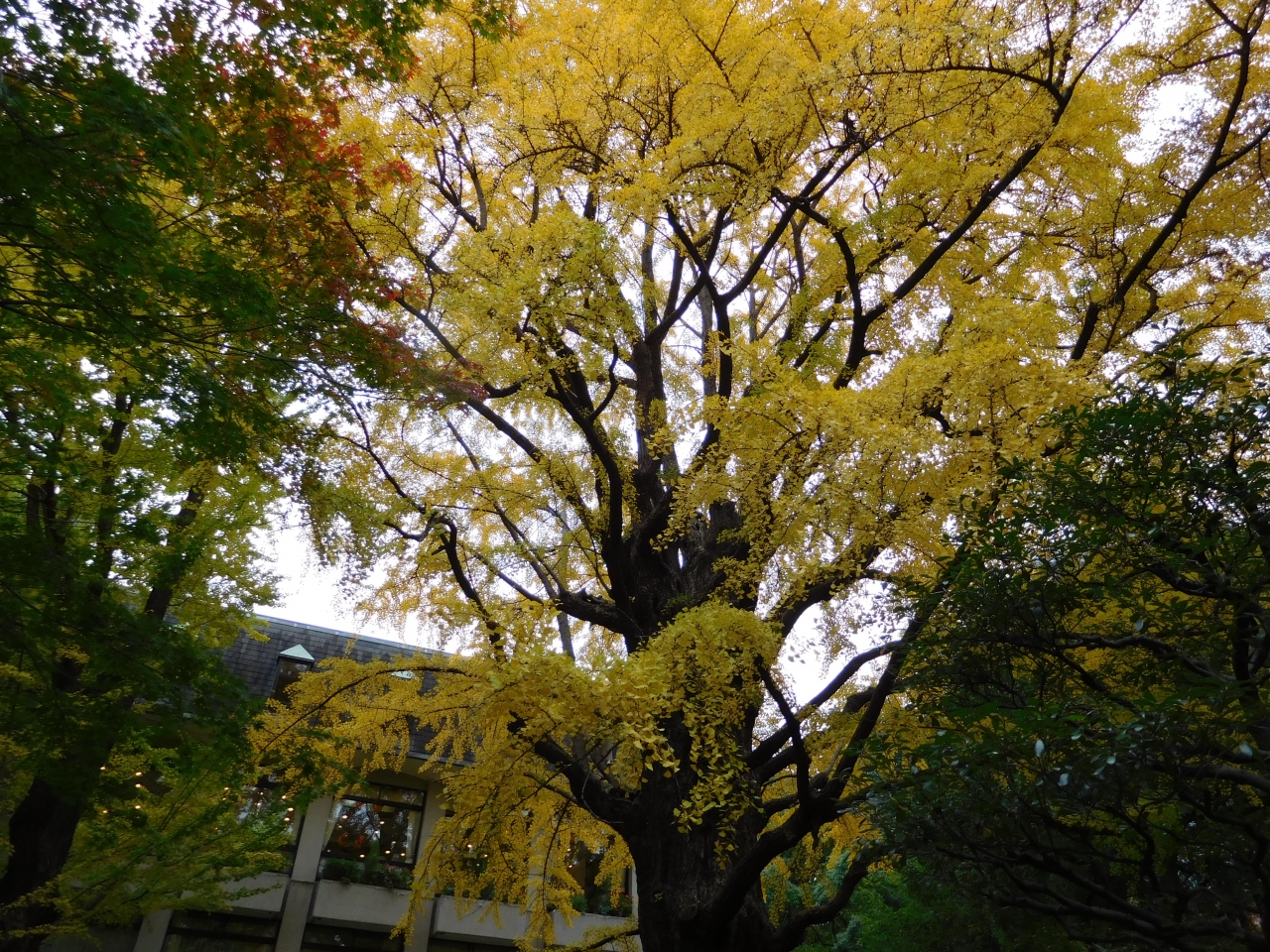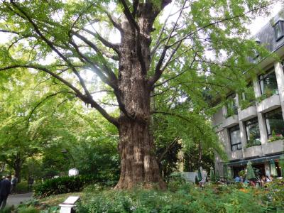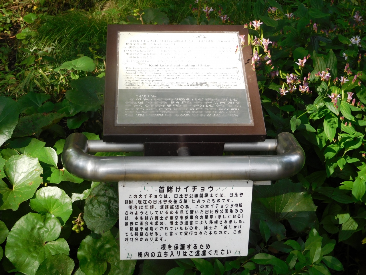 日比谷公園内、松本楼のテラス前に、立派なイチョウの木があります。明治32年頃、日比谷見附にあったこの大イチョウの木が伐採されようとしていた所を、首にかけてでも移植させる、と、まさに命をかけてでも守ってみせるという意気込みを以て、この場所に移動させたようです。現在は、松本楼の建物以上の高さに成長していて、すごく生命力あふれる木で、とても立派でした。また、あまりにも大きくて、木全体の写真を撮るのが難しかったです。