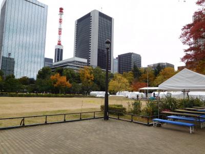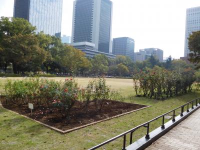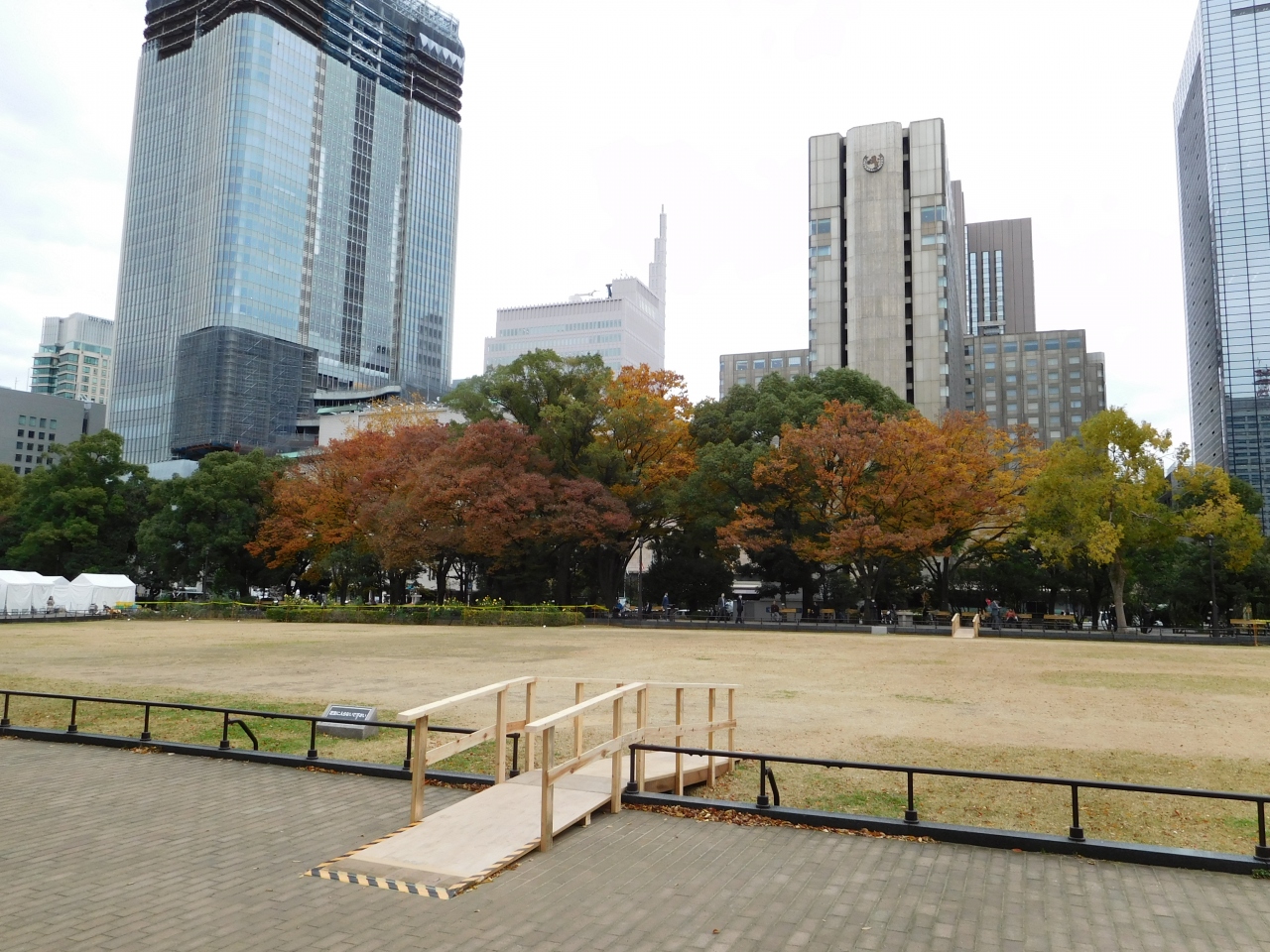 日比谷公園内の噴水広場(大噴水)から見て、日比谷公会堂側にあり、広々とした芝生エリアが広がっています。芝生の周囲には、今の時期はバラが咲いていました。基本的には、芝生には立ち入る事が出来ませんが、たまにイベント開催時には開放されている事があります。(訪れた時は、ちょうどイベントの準備中のようでした。)オフィスビルに囲まれた景色の中、周りの木々が紅葉していて、のんびり出来る場所でした。