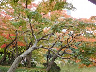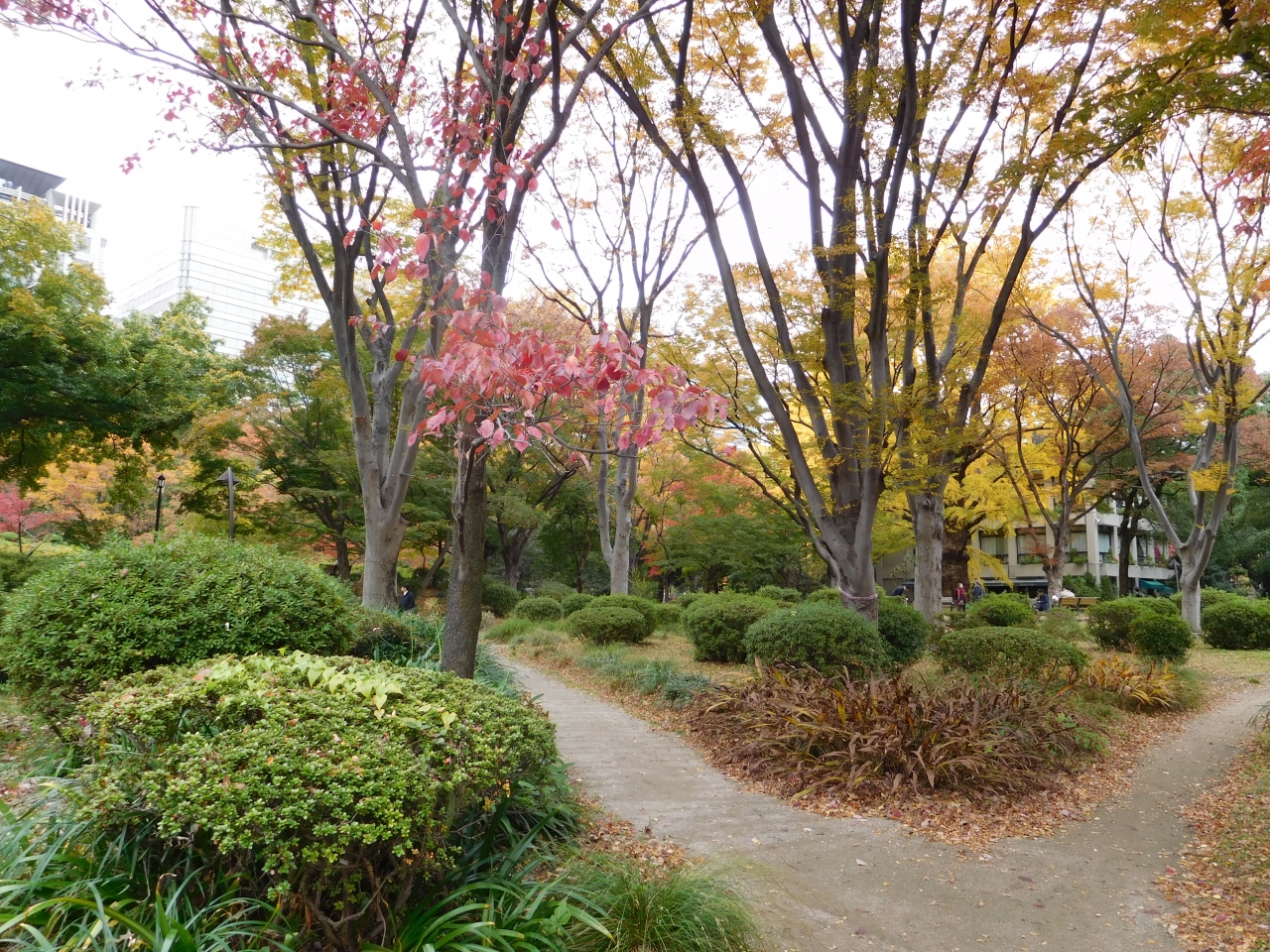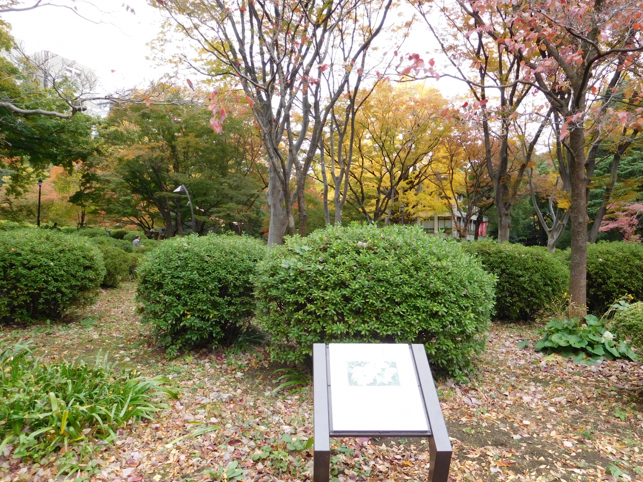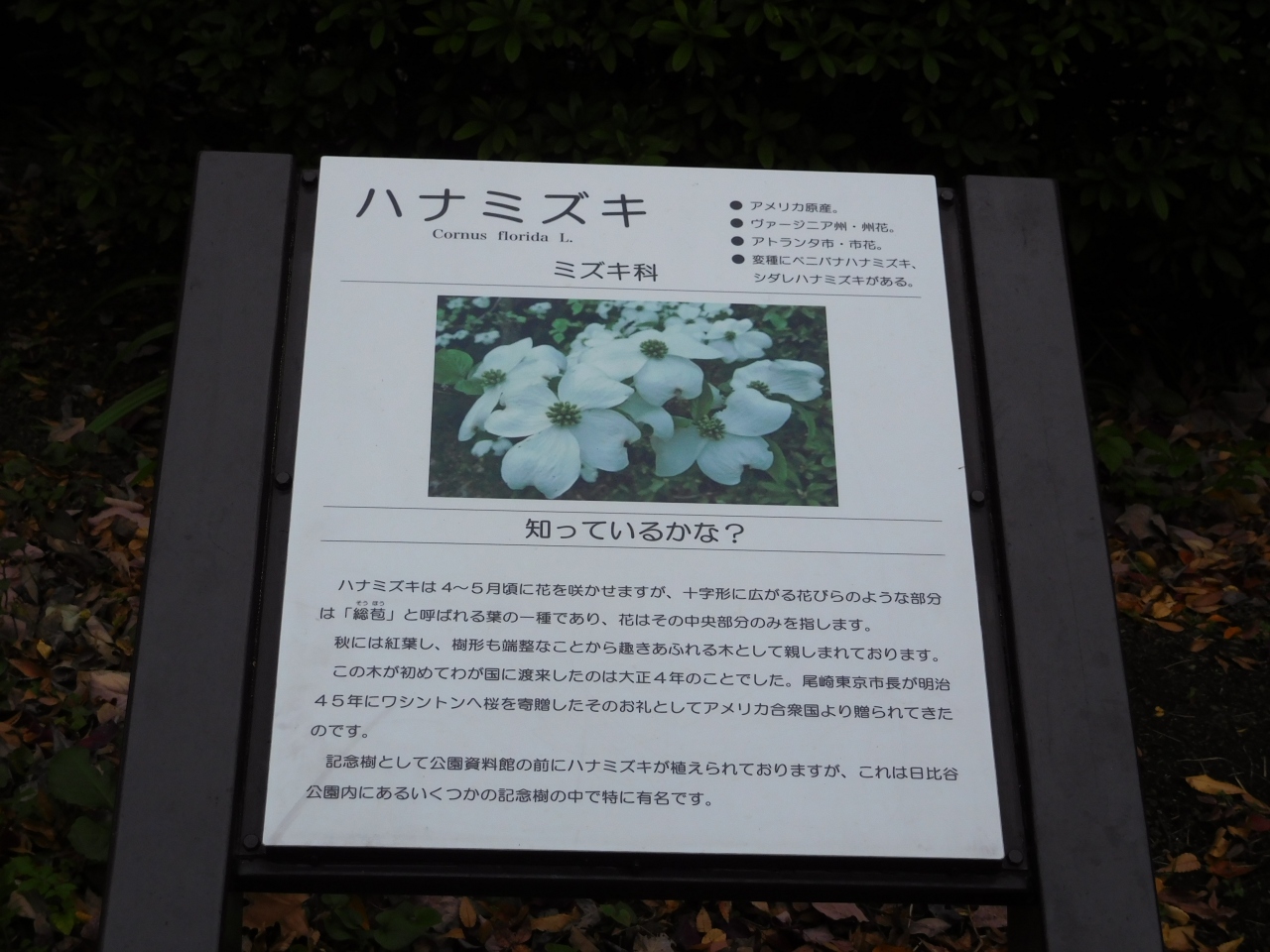 日比谷公園内、第二花壇から雲形池方面へと行く途中にあります。ハナミズキは、アメリカ ワシントンに寄贈した桜のお礼に、アメリカから贈られてきたものです。形よく綺麗に剪定されていましたが、春(4~5月頃)に花を咲かせるので、青々とした状態でした。奥に見える松本楼付近の紅葉が綺麗でしたが、春の時期にまた見に来て見たいと思いました。
