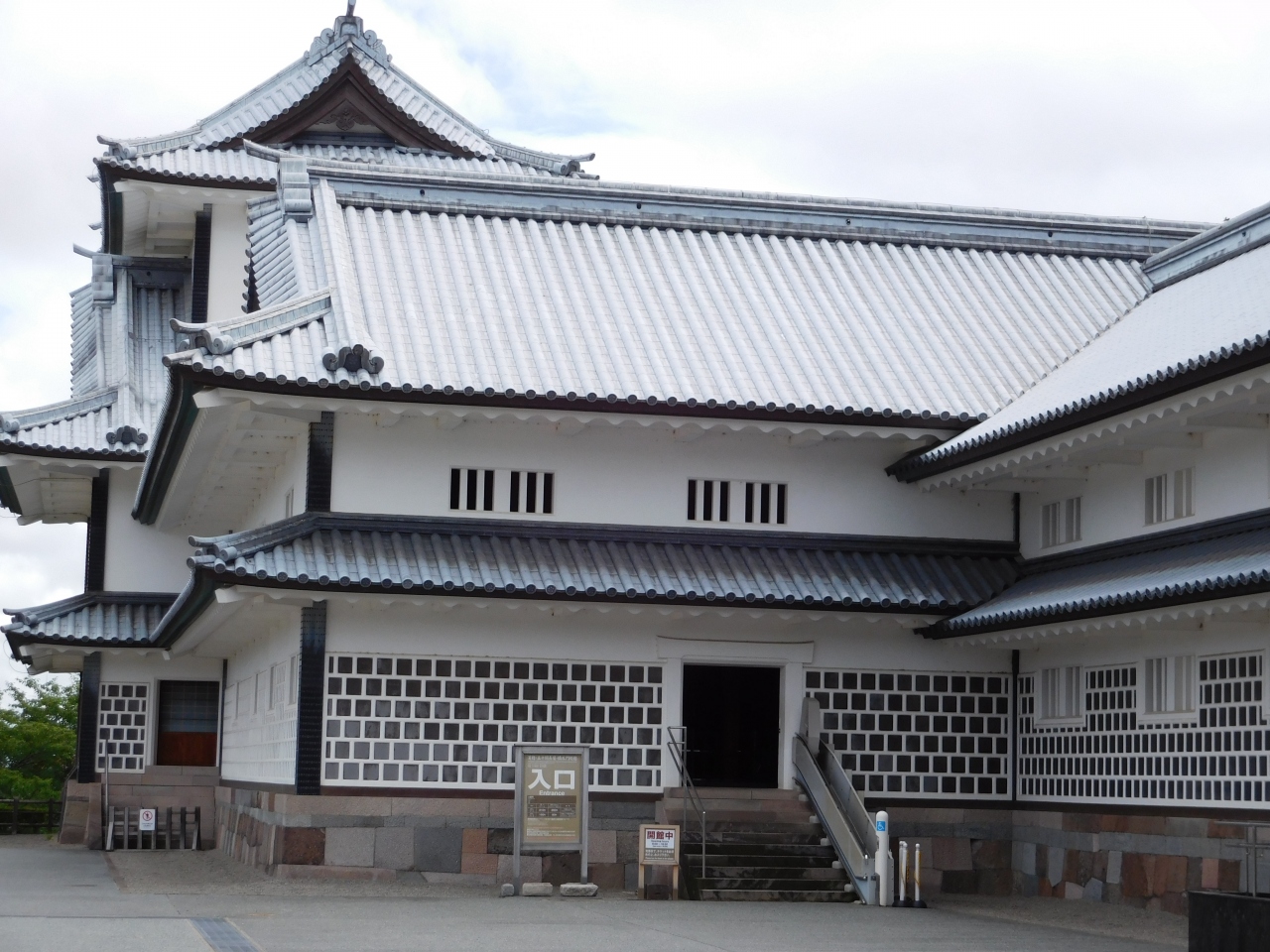 縄張りの都合で歪んだ石垣の角に合わせて建てられた、平面が菱形の物見櫓です。平成13年7月に復元された建物は、内部は有料で見学出来るようになっていました。入館する際は、菱櫓側が入口になっています。三層あり、階段で上に登る事が出来ました。