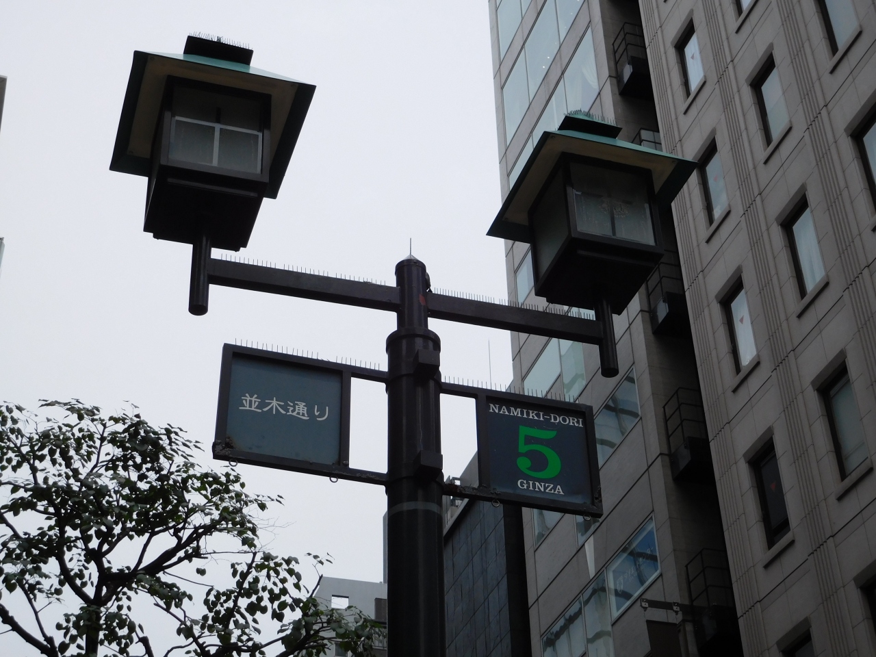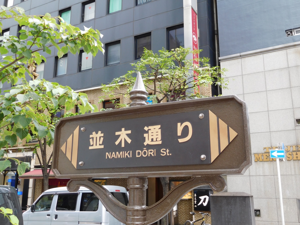 銀座一丁目から八丁目まで、約1000mの一本道の並木通りです。海外ブランドのお店が数多くあり、おしゃれで、歩道もゆったりとしているので、歩きやすい道です。一方、夜はクラブ街として賑わいを見せています。また、並木通りの街灯はおしゃれで、2人の小人が帽子を被ったような姿を見せています。八丁目方面は、ランプが四角なのに対し、晴海通りを渡ると、丸みを帯びていて、ランプのガラスが青色に変わっていたのも印象的でした。