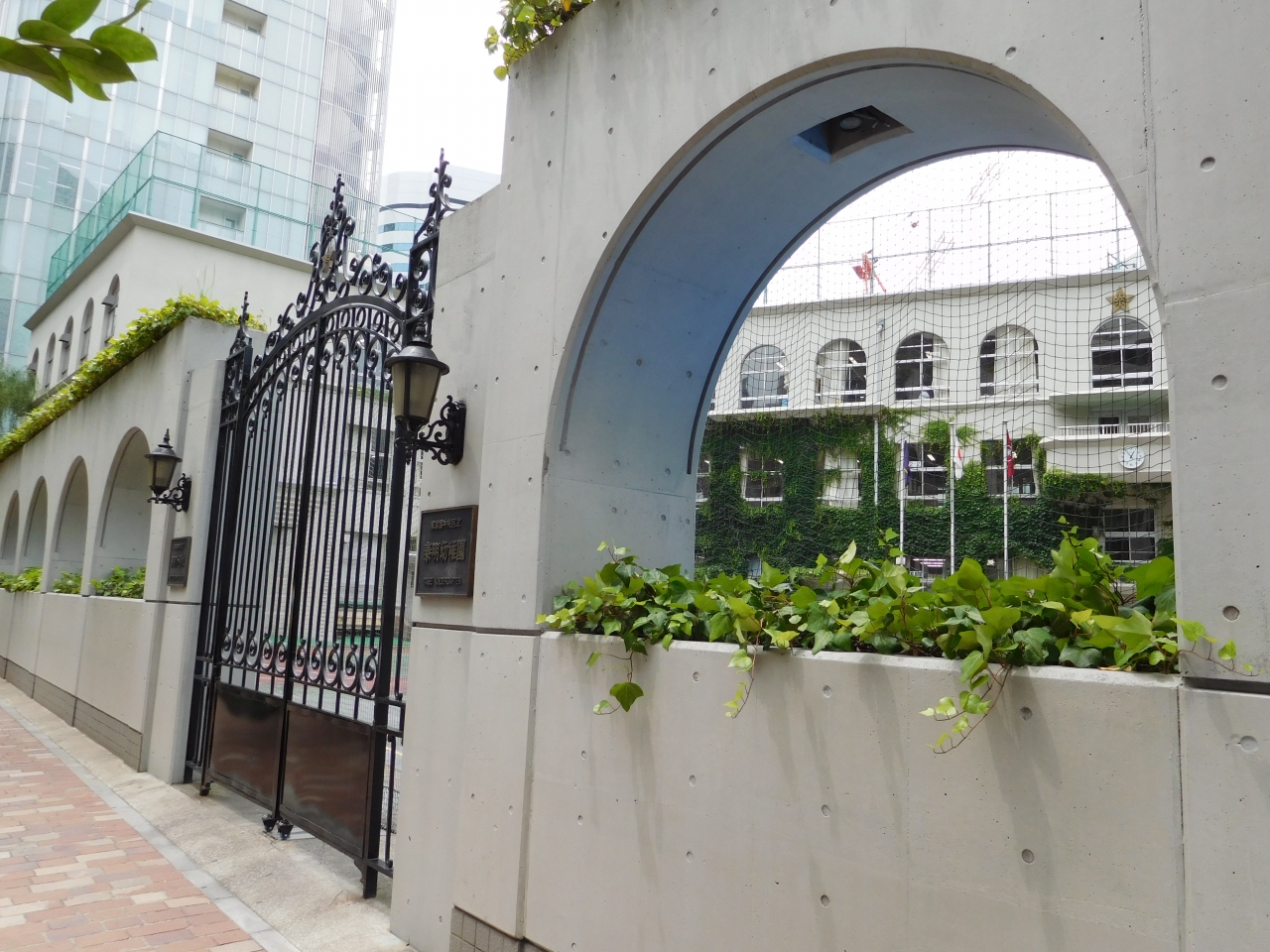 数寄屋橋交差点の近くのみゆき通り沿いにある小学校で、幼稚園と併設されています。半円形の窓と蔦のからまる校舎、アーチ形の塀とヨーロッパのお城のような門(実際に、フランス貴族の館から移築されたようです。)が、おしゃれで印象的でした。学校の前には、平成20年度 経済産業省「近代化産業遺産」と書かれたプレートの他に、「みゆき通りと門扉」に関する説明書きのプレートが掲げられていました。