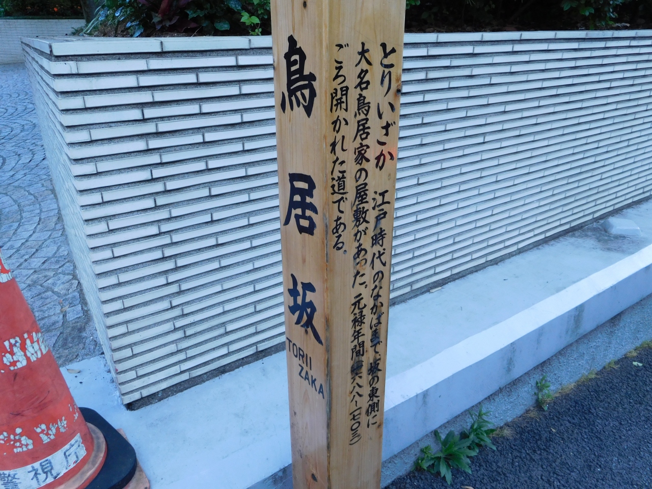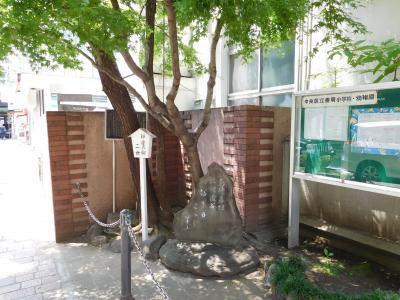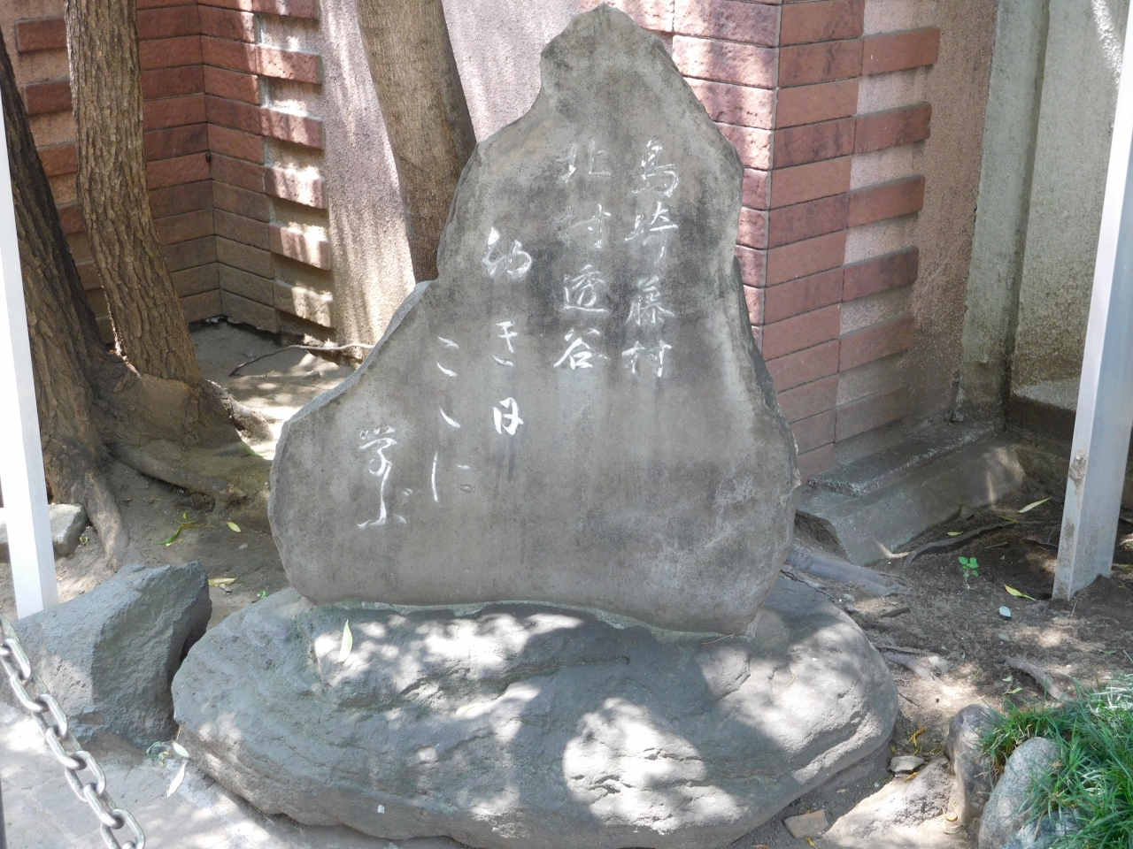 泰明小学校の玄関の左側に、「島崎藤村 北村透谷 幼き日 ここに 学ぶ」と書かれた、シンプルな石碑がありました。石碑の説明板が壁際に設置されていましたが、銀座の柳二世の木の奥側になってしまう為、チェーンを気にしながらも近づいて見ないと読みずらくなっていたのが残念でした。
