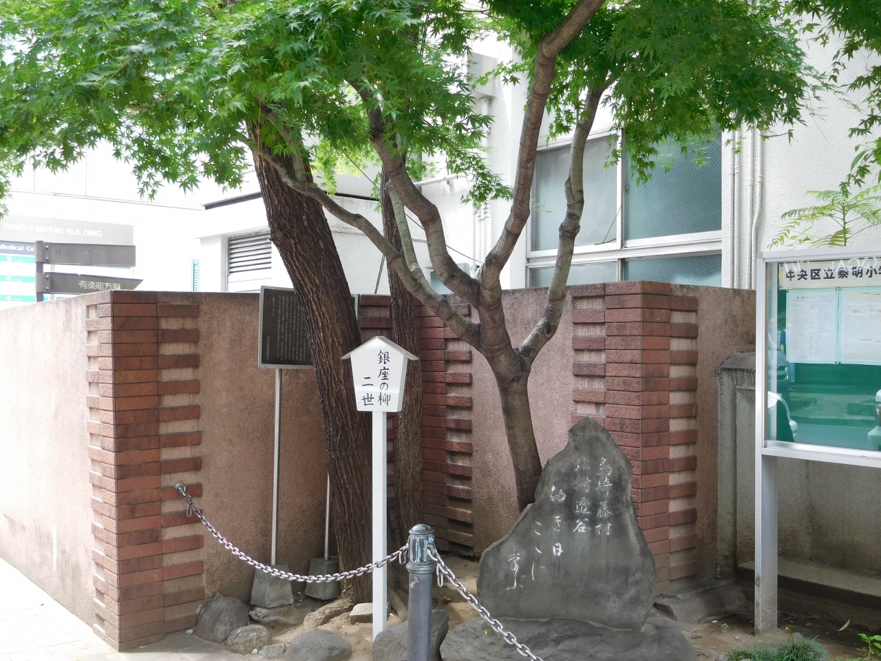 銀座みゆき通り沿いにある、泰明小学校のすぐ左側、赤いレンガの壁際に植えてあります。「銀座の柳 二世」と書かれたシンプルな札だけがあり、近くには、説明書きはありませんでした。小学校のすぐそばに植えてあるので、子供達の成長を見守りながら、ぐんぐんと育っている感じがしました。