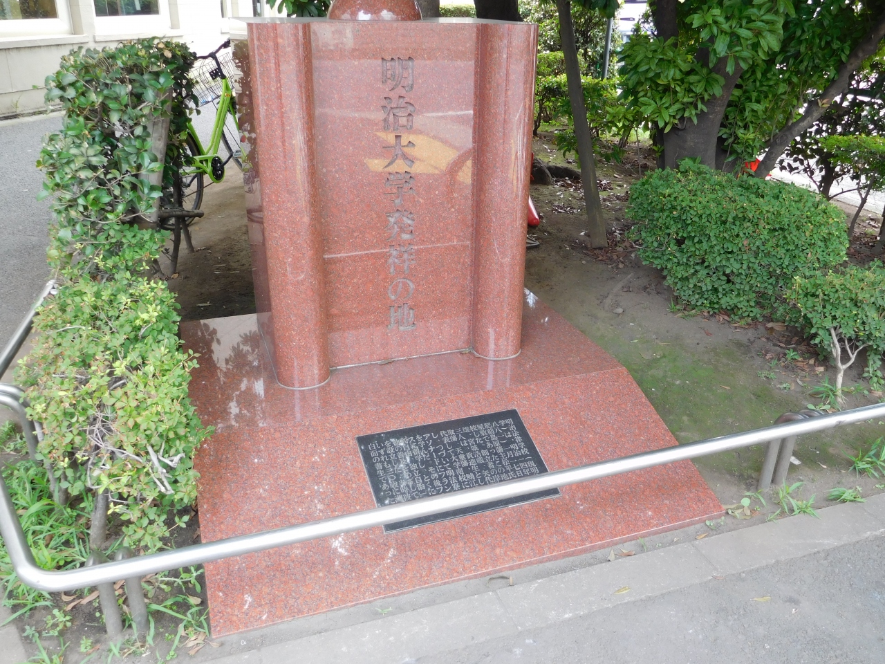 数寄屋橋交差点から日比谷公園方面へと、晴海通り沿いを歩いている途中で見つけました。割と大き目の赤色の石碑があったので、何だろう?と思わず足を止めてしまいました。明治法律学校(現明治大学)は、明治14年にこの地で開校した事が書かれていました。銀座を散策していると、いろいろな発見があります。