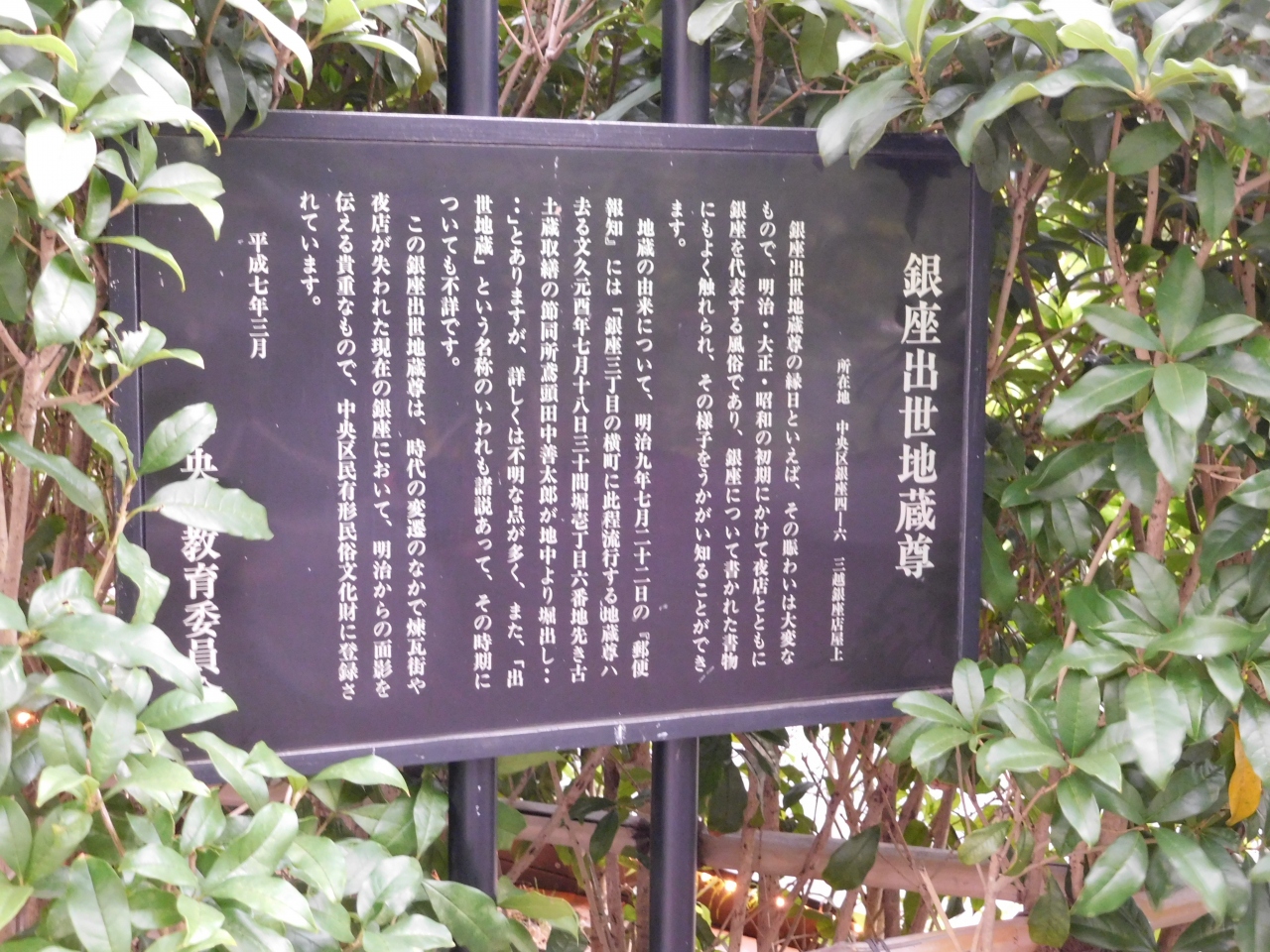 銀座三越の9階、屋外にある銀座テラスの右奥側にあります。ちょっと回り込んだ場所にあるので、以前、銀座テラスを利用した際は全く気付きませんでした。(こんな場所に何かあるのかな、と若干不安になりながら歩いて行くとありました。)ほっこりとした表情のお地蔵様でした。