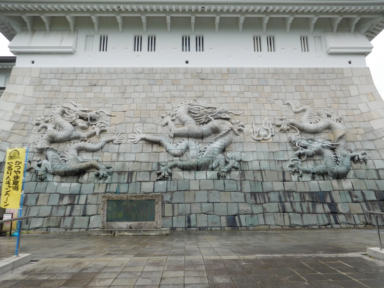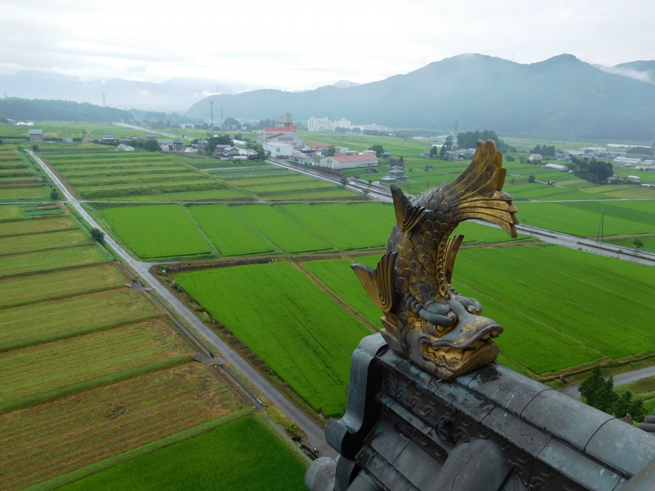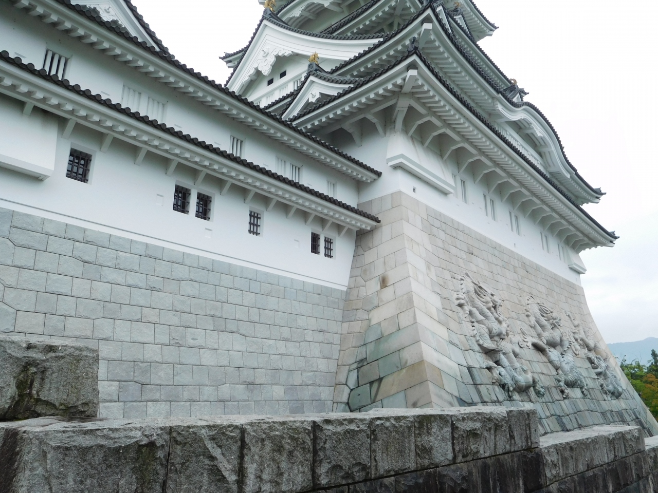 田園風景の広がる中に、日本一の天守閣があるお城があるので、遠くからでもとても目立ちます。どんなお城か気になるので、行ってみる事にしました。城壁には、九頭竜にちなんで合計9匹の龍が彫刻されていて、近くで見るとかなり迫力がありました。日本のお城なのに、中国の文化を取り入れているような感じで、ちょっと違和感もありましたが、模擬天守だからこのデザインになったのかなと思いました。お城の中は、コレクションの展示といった感じでした。これだけ広いお城(博物館)ですが、中は土足禁止でスリッパに履き替えての見学でした。