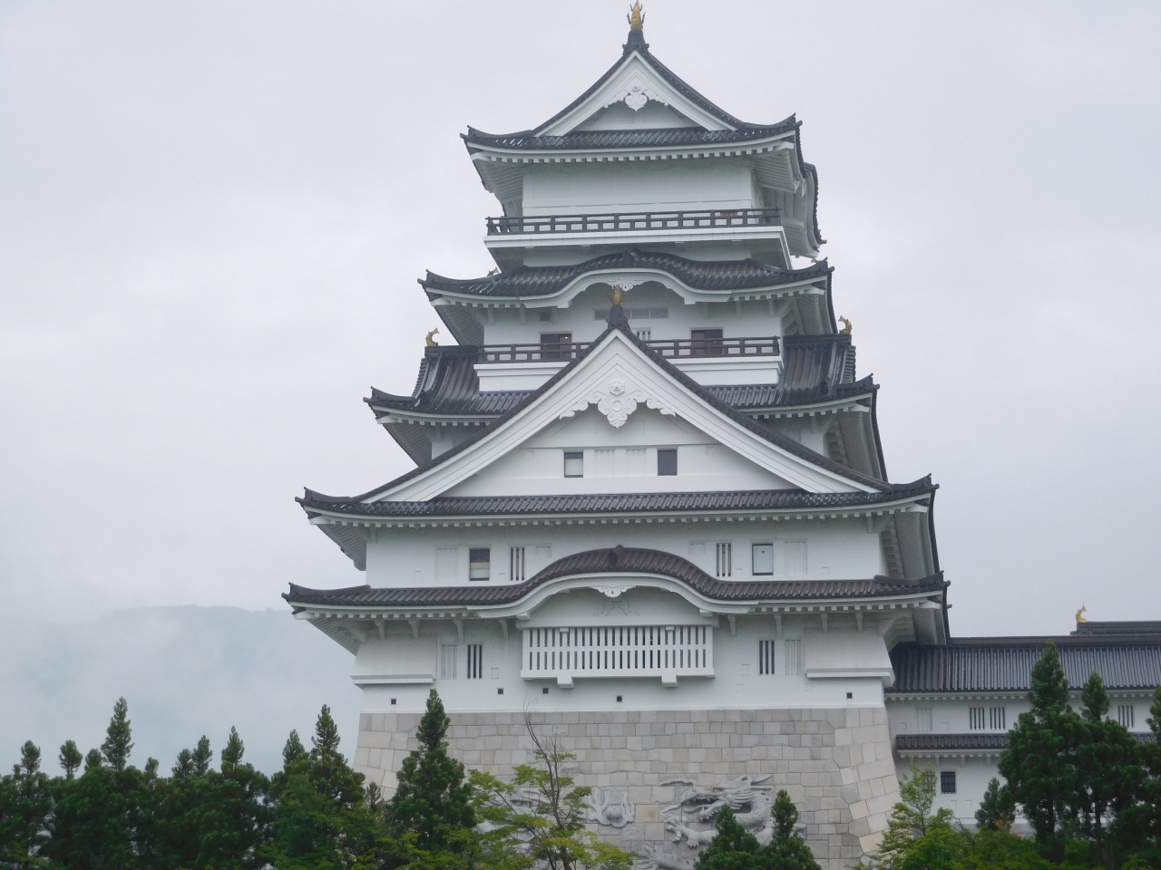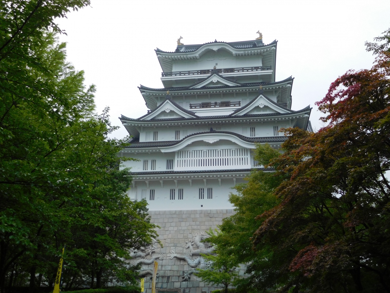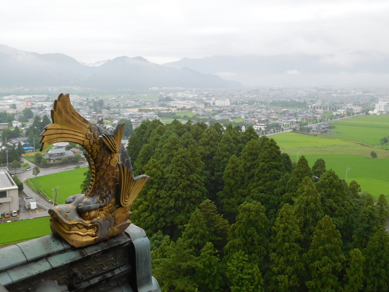 田園風景の広がる中に、日本一の天守閣があるお城があるので、遠くからでもとても目立ちます。どんなお城か気になるので、行ってみる事にしました。城壁には、九頭竜にちなんで合計9匹の龍が彫刻されていて、近くで見るとかなり迫力がありました。日本のお城なのに、中国の文化を取り入れているような感じで、ちょっと違和感もありましたが、模擬天守だからこのデザインになったのかなと思いました。お城の中は、コレクションの展示といった感じでした。これだけ広いお城(博物館)ですが、中は土足禁止でスリッパに履き替えての見学でした。