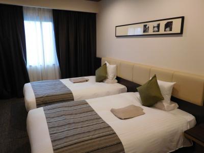 デラックスツインルームは34?もの広さがあり、なかなかおしゃれで、照明の数も多くて、ゆったりと快適に過ごす事が出来ました。荷物を広げたり、濡れた傘を乾かすスペースも十分にありました。枕元にもコンセントがあったり、枕も3種類用意されていて、その内の一つは、ブランケットが中に入っている兼用タイプのものになっていました。折角、広々した部屋に泊まれるから、観光を早目に切り上げて部屋でもゆっくり過ごさないと勿体ないと感じてしまう程でした。金沢という場所柄、海外からのお客さんも多く、翌朝の朝食は、近くの席が見事に中国人に囲まれてしまい、中国語が飛び交っていて、あまりゆっくり食事できる雰囲気では無くなってしまったのが、ちょっと残念でした。