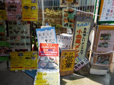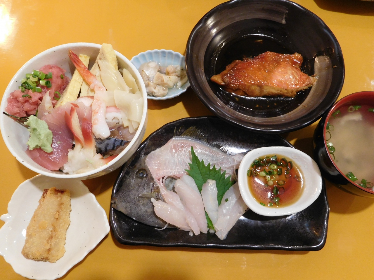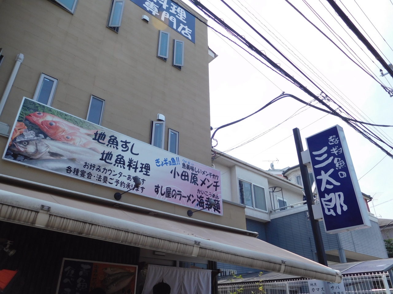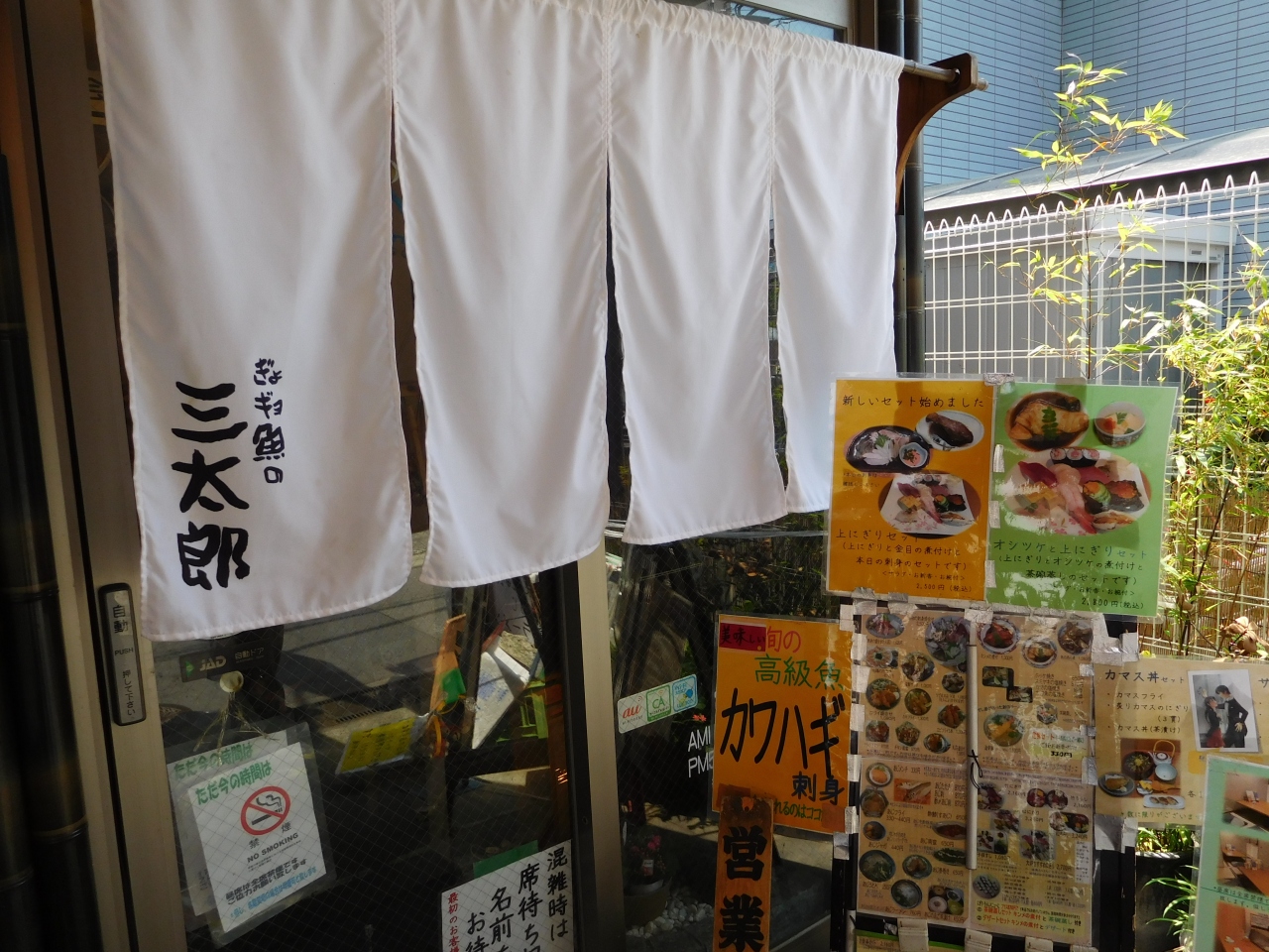 地魚すし・地魚料理のお店で、店頭には沢山のメニューが賑やかに並んでいました。オススメのカワハギ刺身セットを注文しましたが、お刺身、海鮮丼、金目の煮付、サラダ、小鉢、あら汁がついて、1500円+消費税でした。すごくお得な内容で、とても美味しかったです。通りから少し入った所にあるので、曲がり角にも沢山のお店の宣伝がありました。お店の看板には「ぎょギョ魚の三太郎」と書いてありますが、お店のレシートは「三太郎鮨」となっていました。