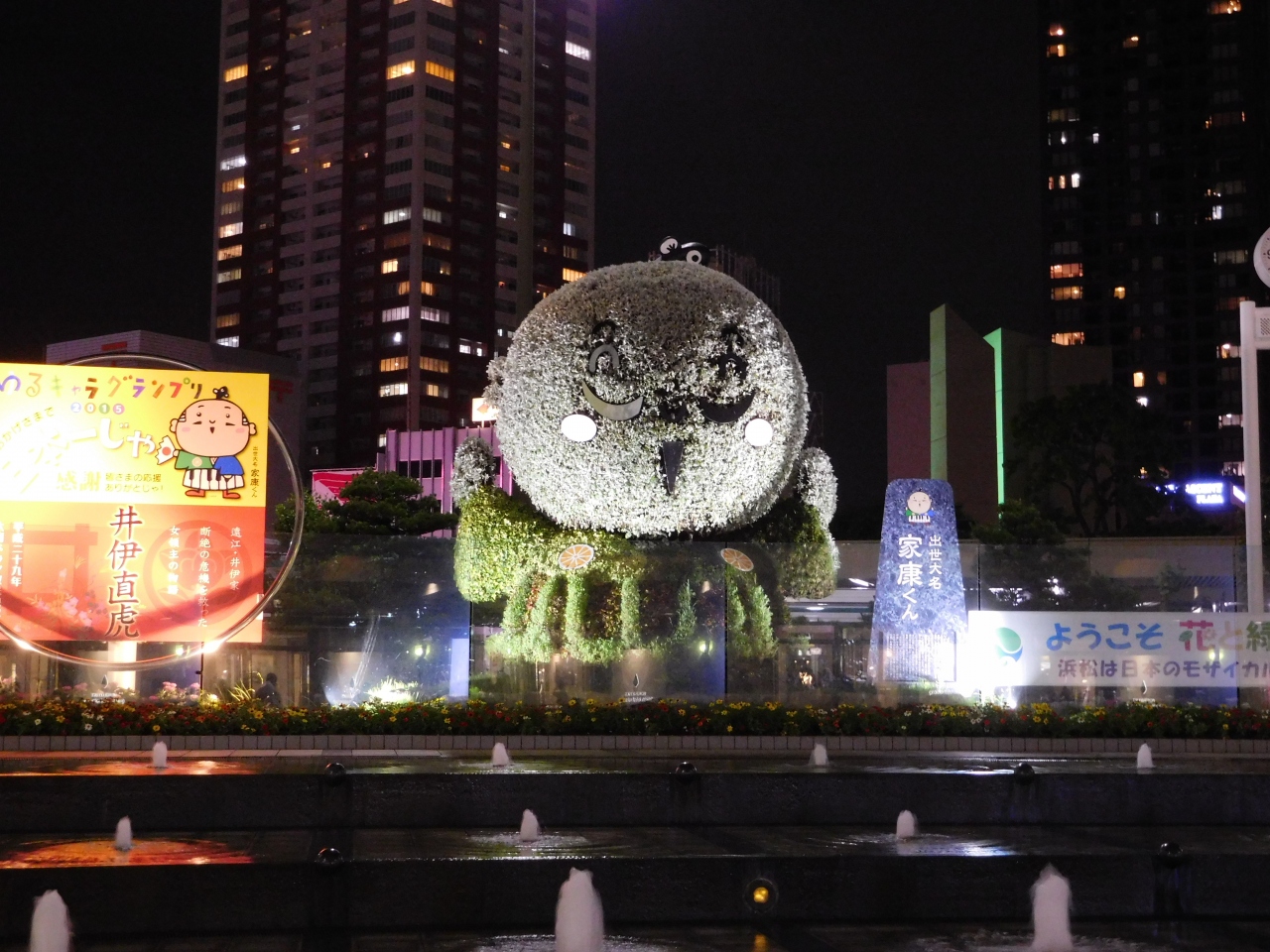 JR浜松駅前北口広場(噴水広場)にある、高さ約4メートルのモザイカルチャーです。約8200株の苗を使用して、徳川家康をモチーフにして造られています。浜松駅に到着したのが夜だった為、薄暗い雰囲気の写真になってしまいましたが、広場に出るとすぐに分かるほど、存在感がありました。イルミネーション仕様にはなっていないので、昼間に訪れて見た方が良いです。