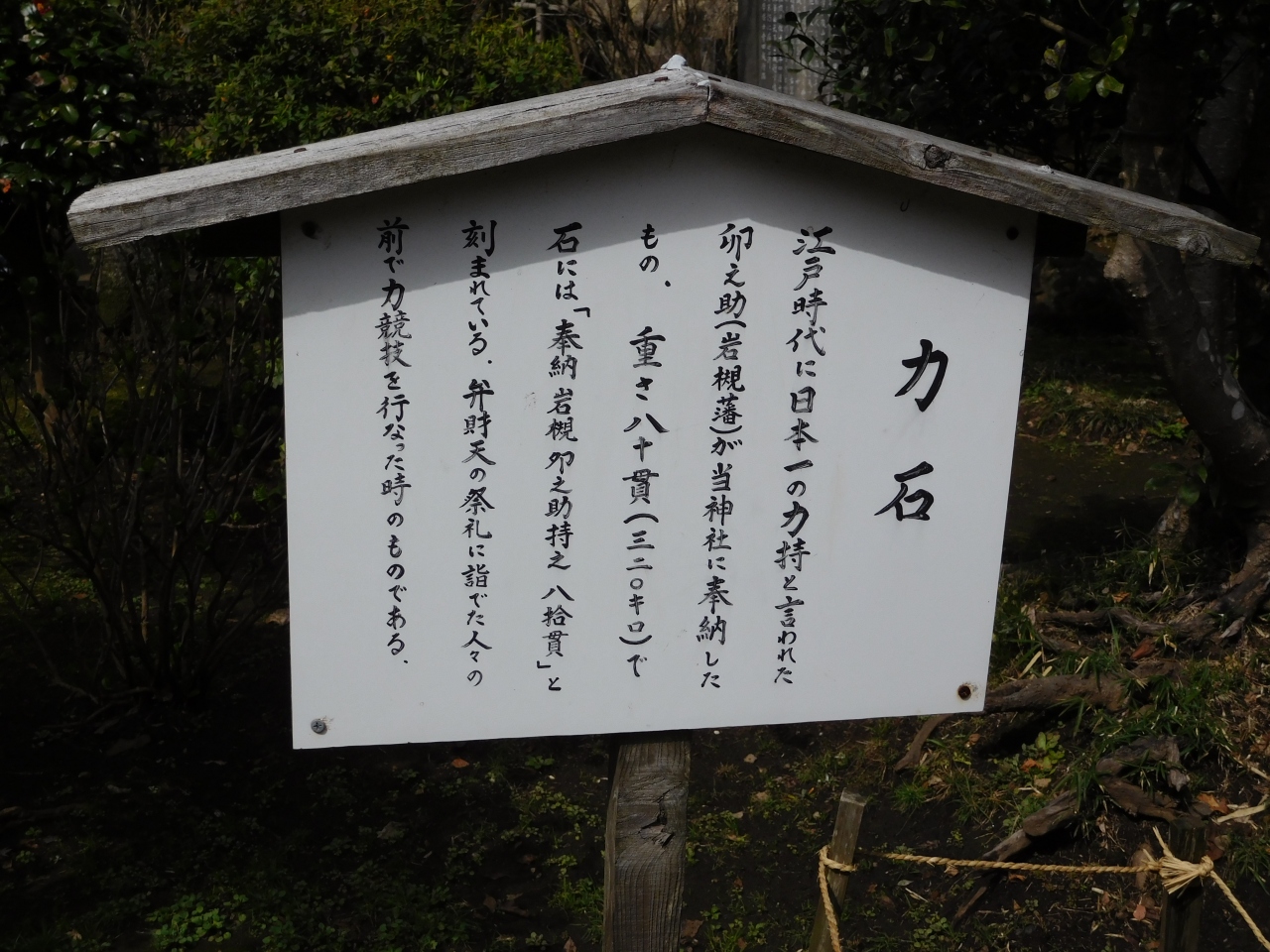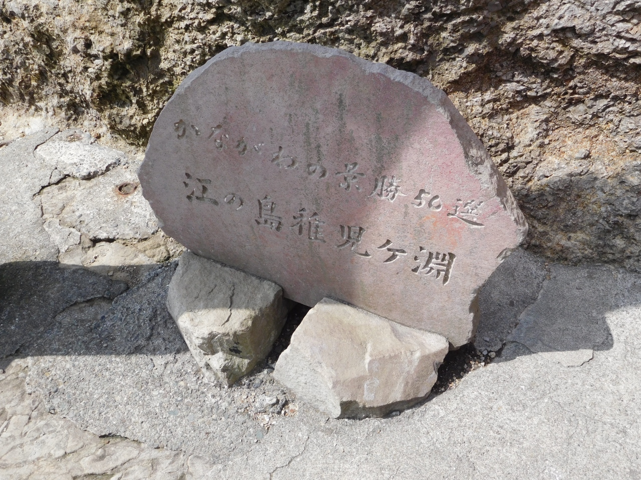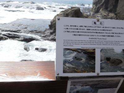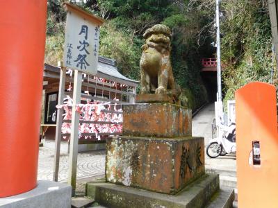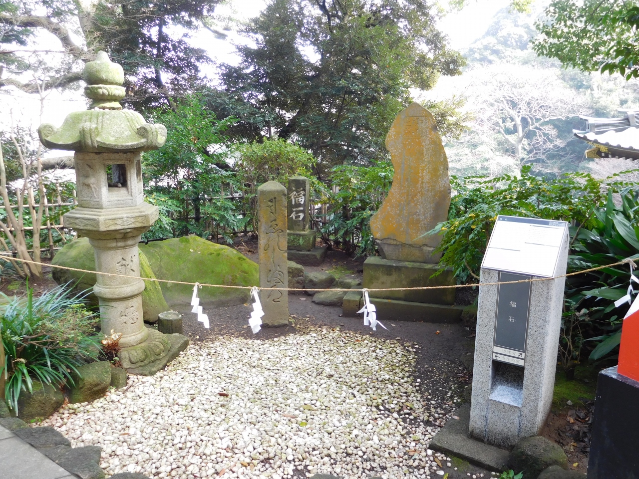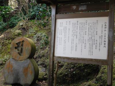 江島神社の一番奥にある「奥津宮」にあります。亀石(亀甲石)の案内板があり、割とすぐに場所が分かりました。亀の甲羅の形をした石が、大きなイチョウの木の下に置かれています。鎌倉四名石の一つのようです。すぐ近くには、力石もありました。