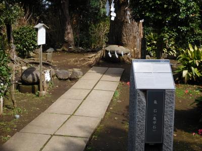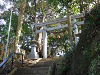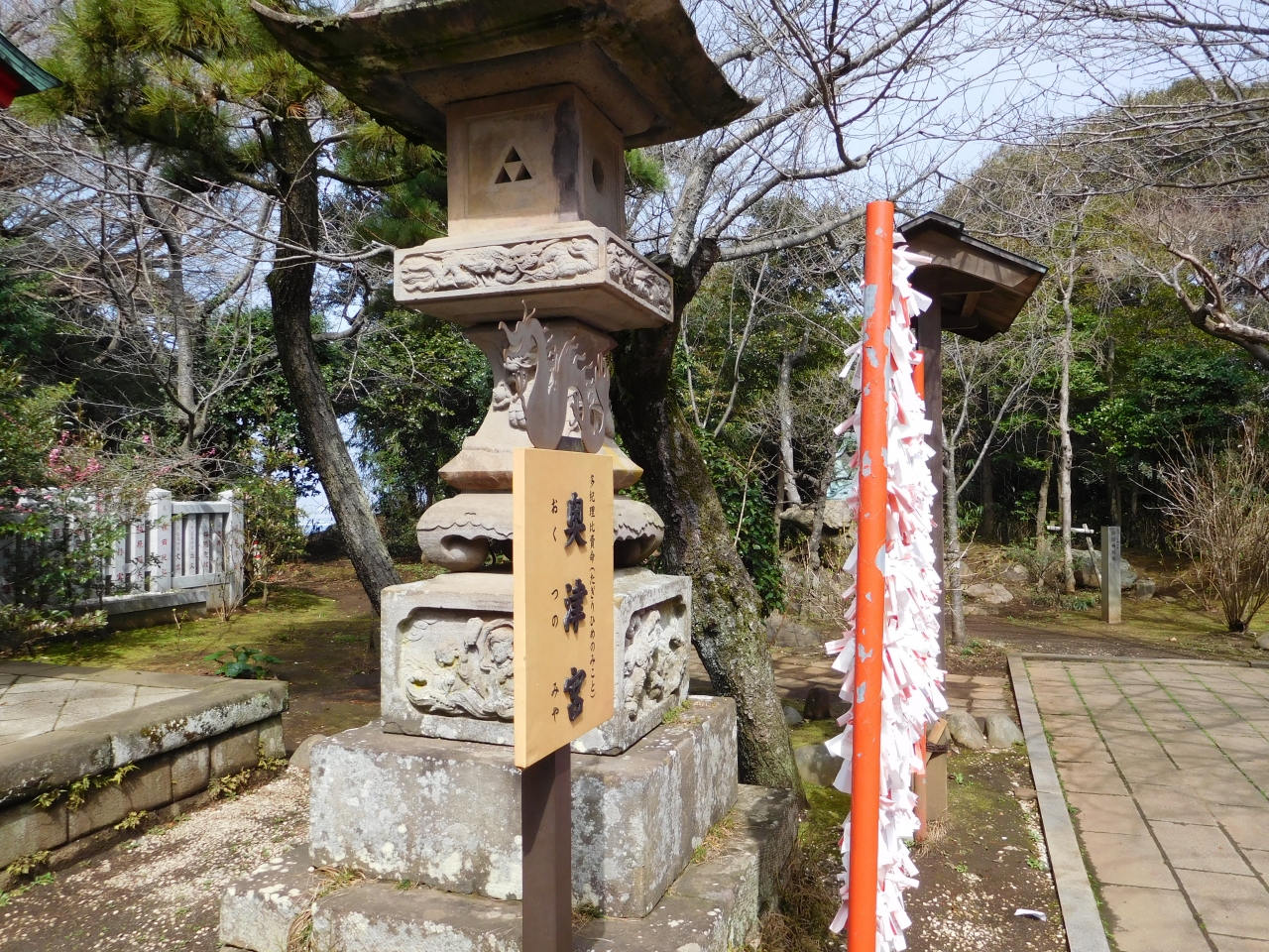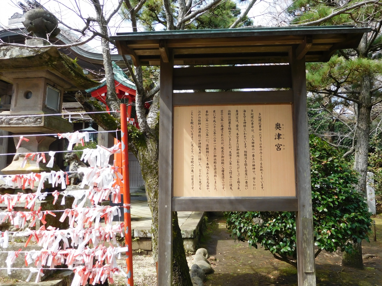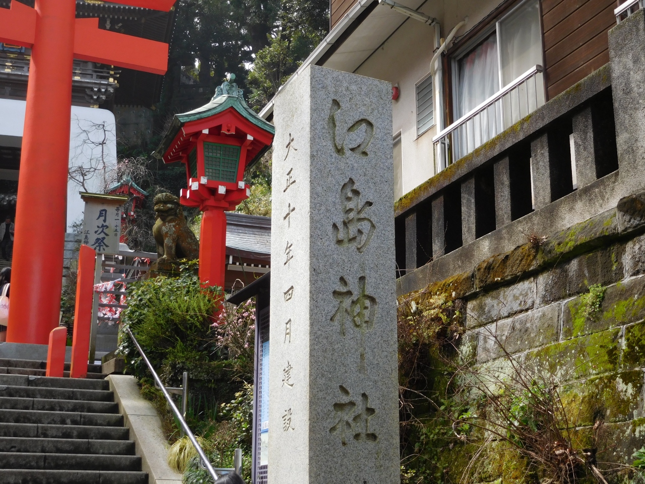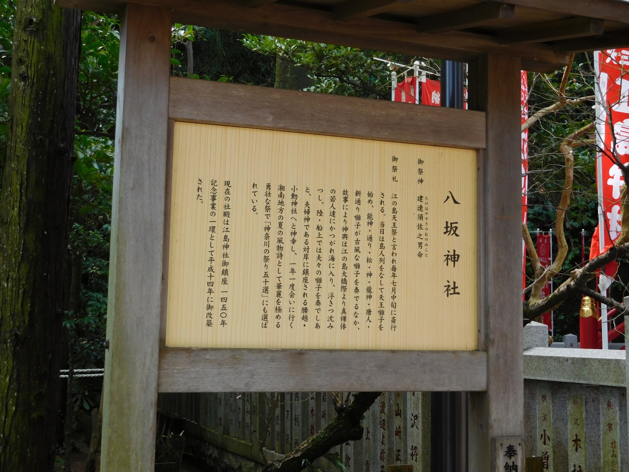江島神社 辺津宮の境内にある、こじんまりとした小さな神社で、建速須佐之男命(たけはやすさのおのみこと)が祀られています。すぐ右隣には「奉安殿」があり、向かい側には、イチョウの御神木である「むすびの樹」があります。